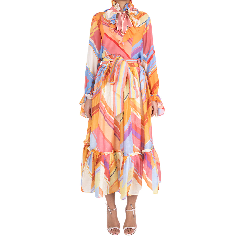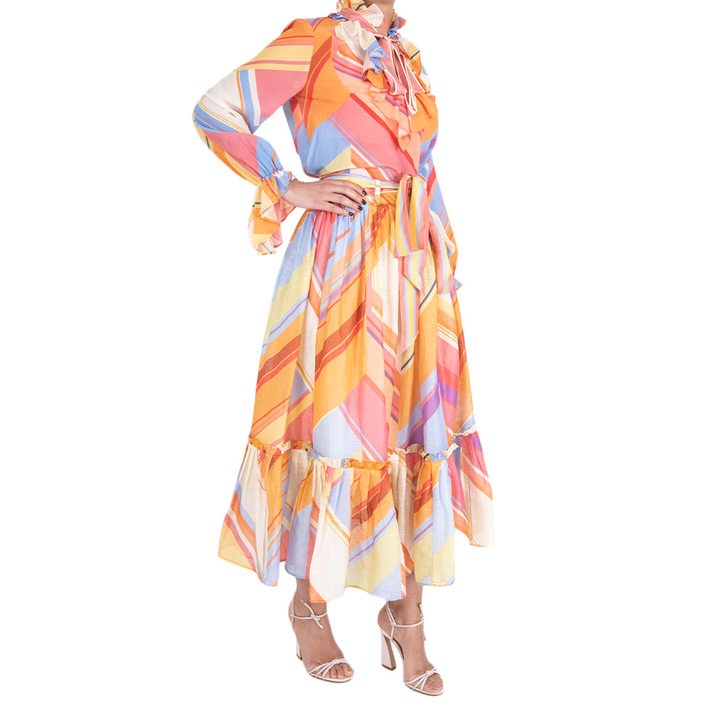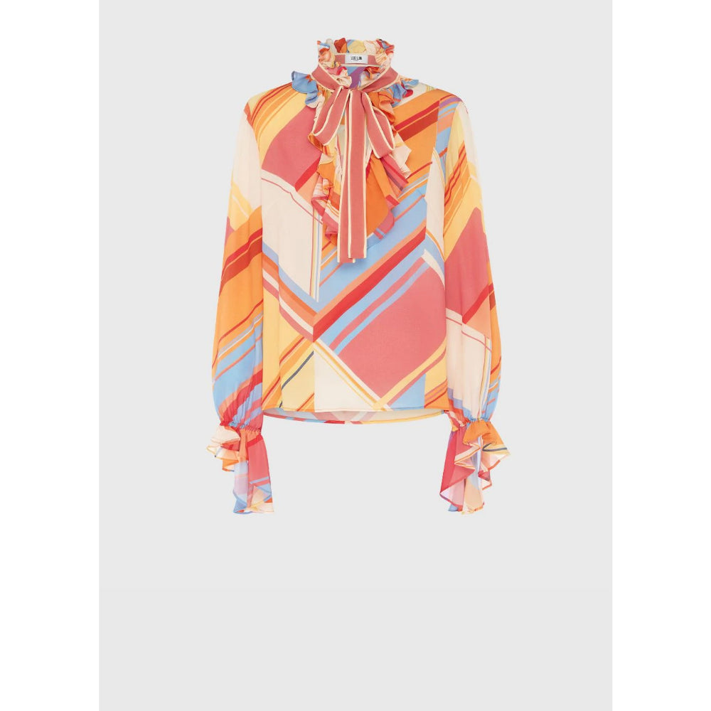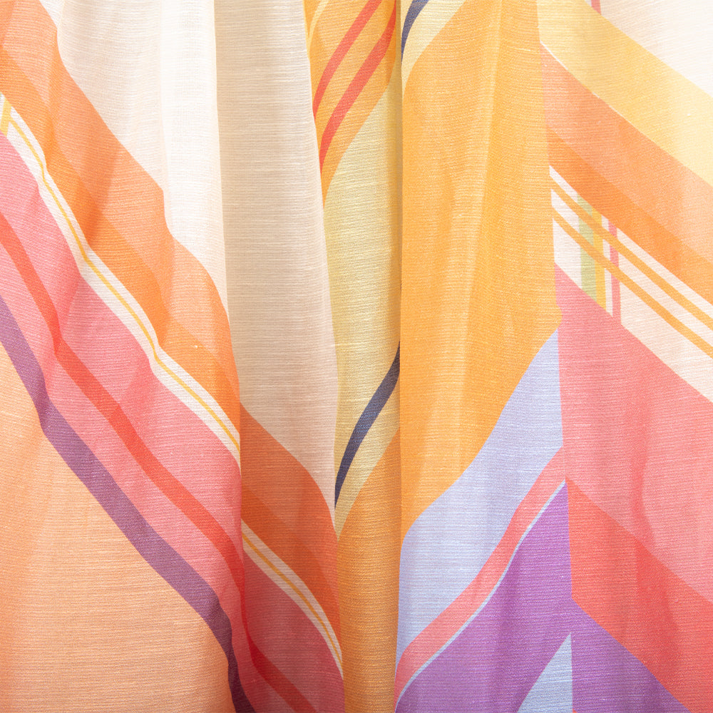 A popular new addition to this season's print wardrobe, shaped by rich colour blocking to represent Frida's inner world. The orange, pink, yellow and green symbolise Frida's innate sense of optimism, love, and her unwavering faith while the purple and blue evoke the artist's internal ache. The print's rich colour palette complements its cubism art style; all staggered angles and criss-cross patterns. An arranged beauty, just as Frida decorated her life with colours, using painting as a means of self-expression.