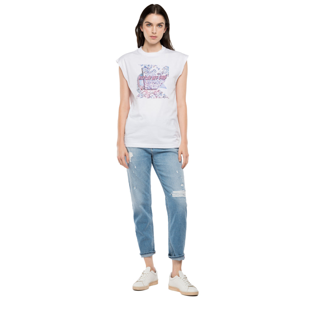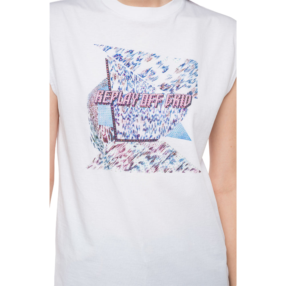 Women's crewneck t-shirt in solid-coloured cotton jersey, regular fit, cap sleeves, ribbed collar, contrasting-coloured edges on the shoulders, REPLAY OFF GRID print with kaleidoscopic effect.