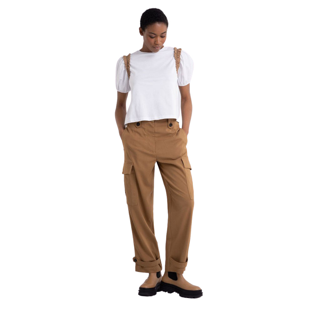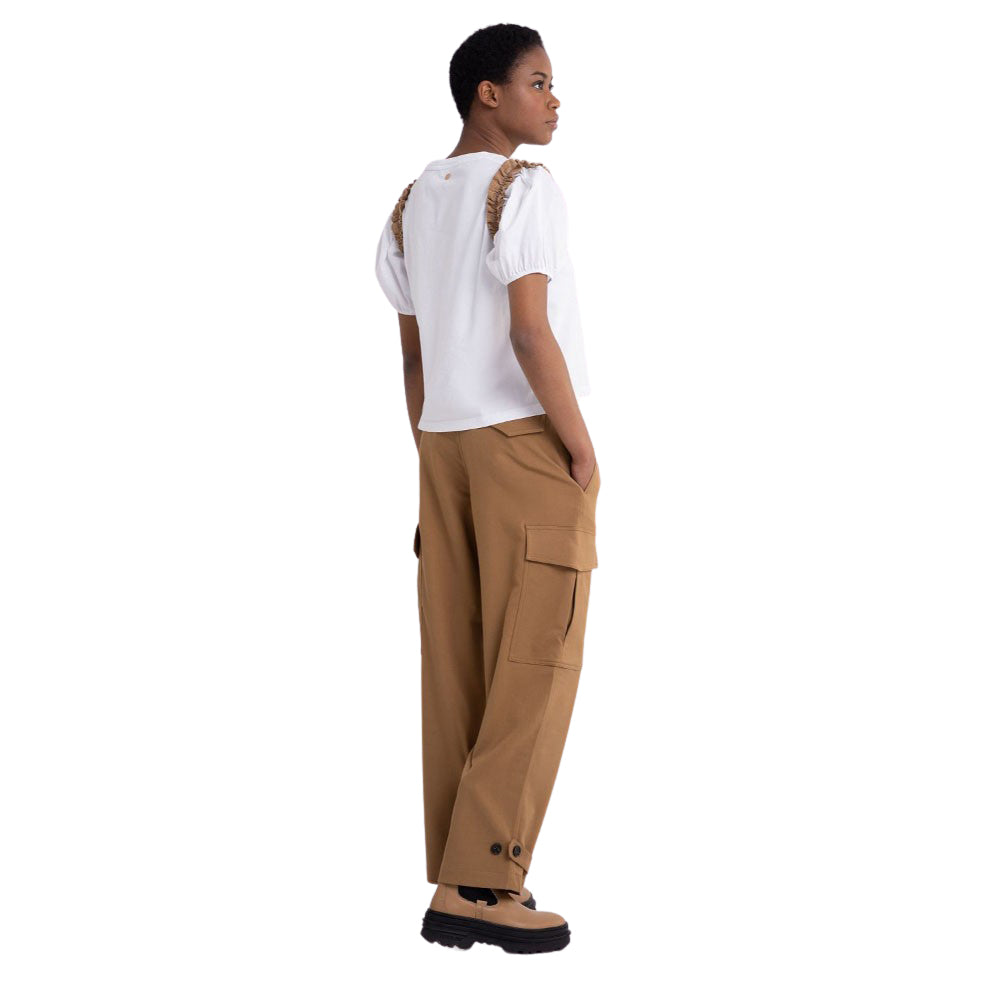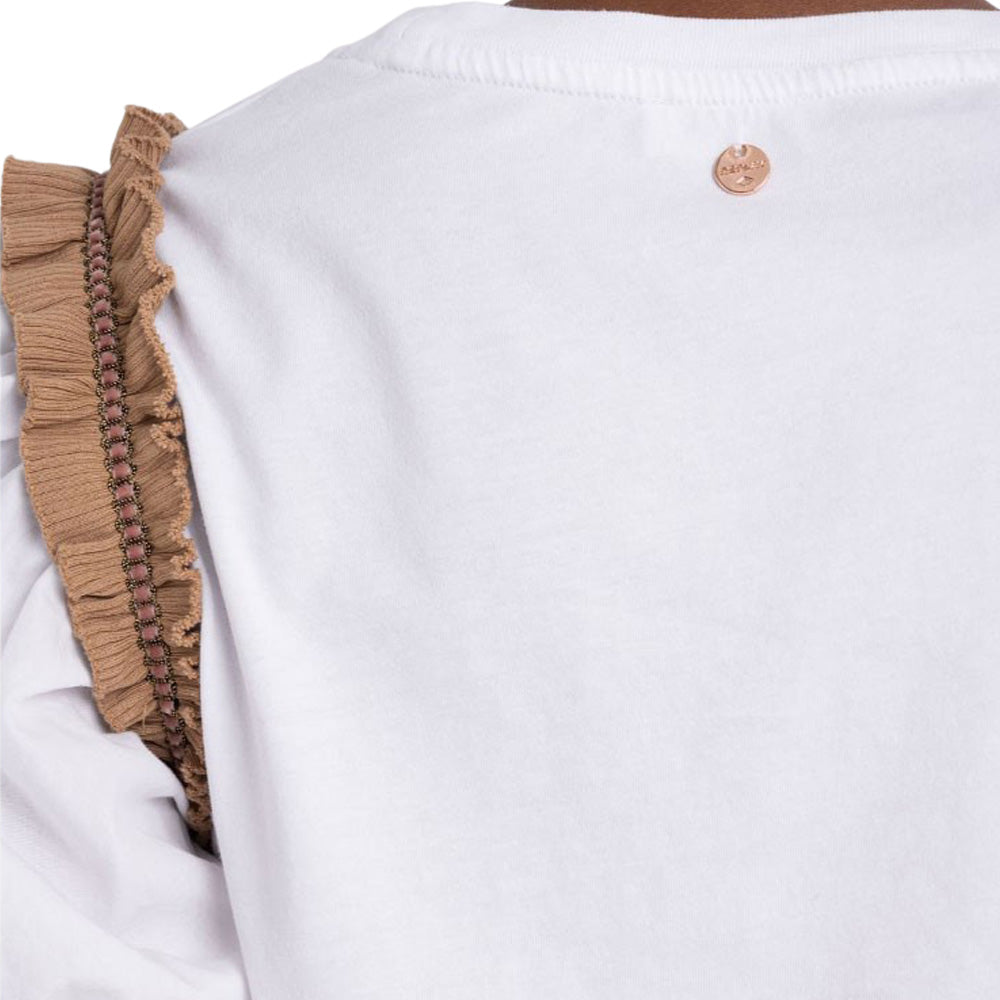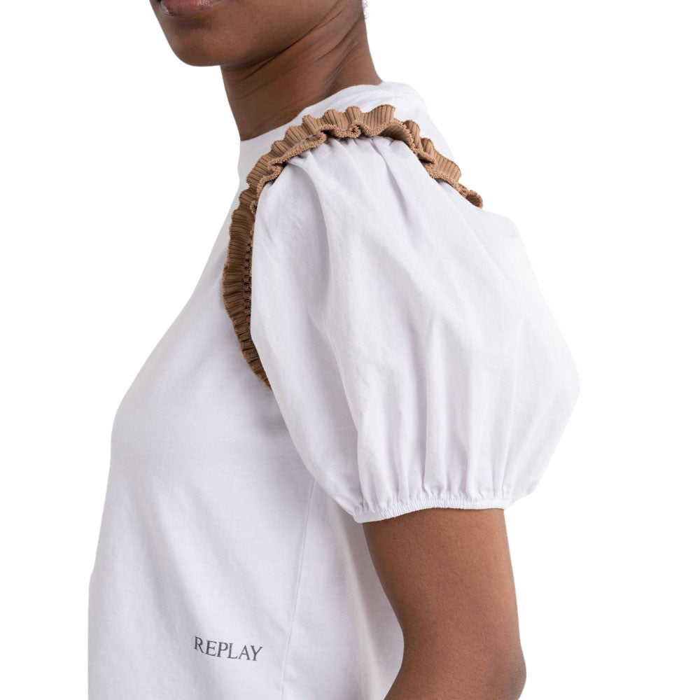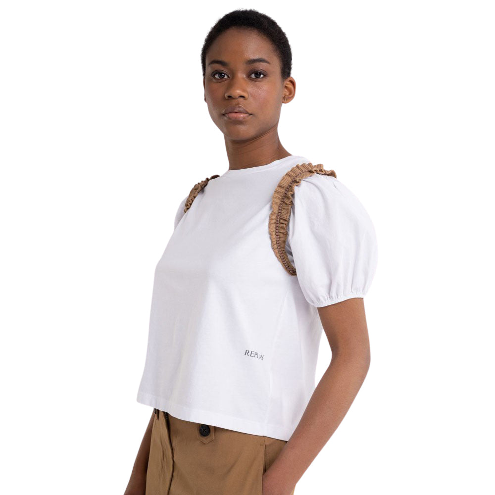 Crewneck t-shirt made of solid-colored light cotton jersey. With regular fit, the garment stands out for the short balloon sleeves with contrasting-colored ruffles refined by ethnic details on the armholes.
