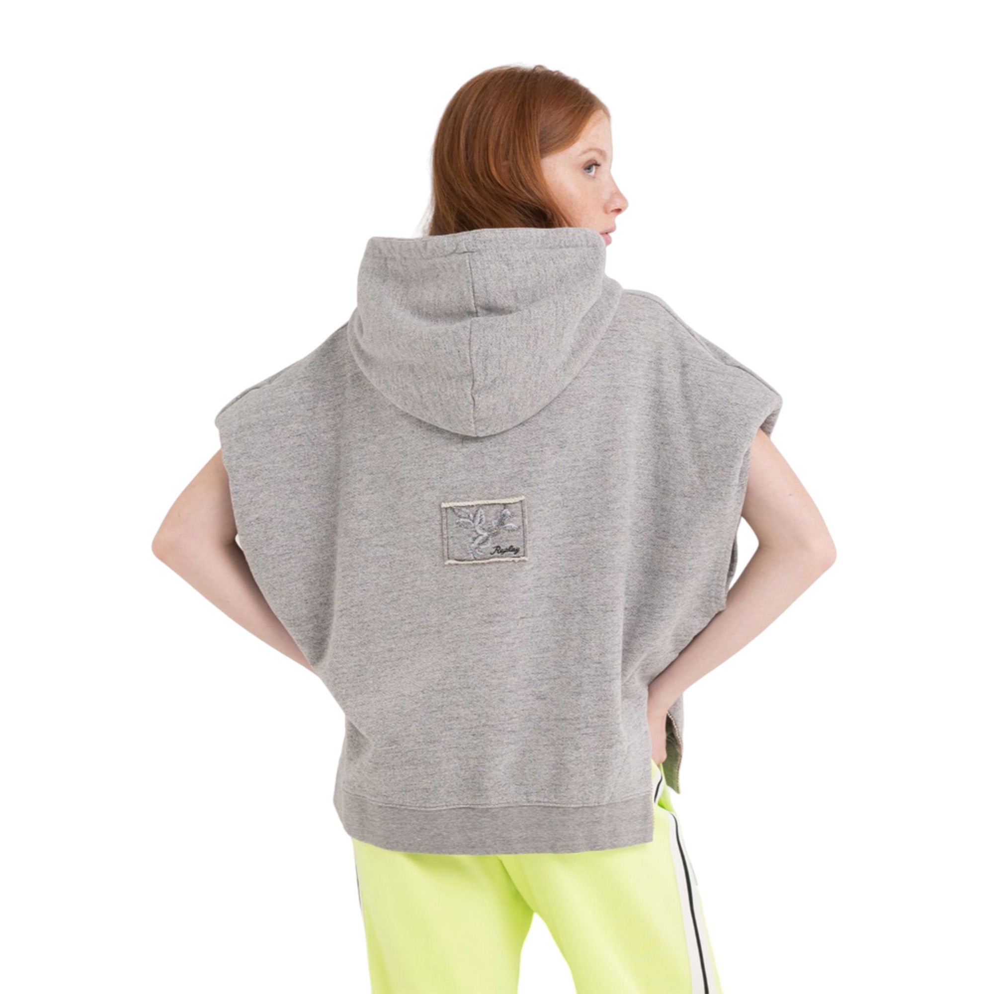 Sleeveless hoodie with button made of mouline cotton blend. With oversized fit, the garment is characterized by the side slits refined with rhinestones. The item is enhanced by the customized print at the front and by the satin label embroidered at the back.