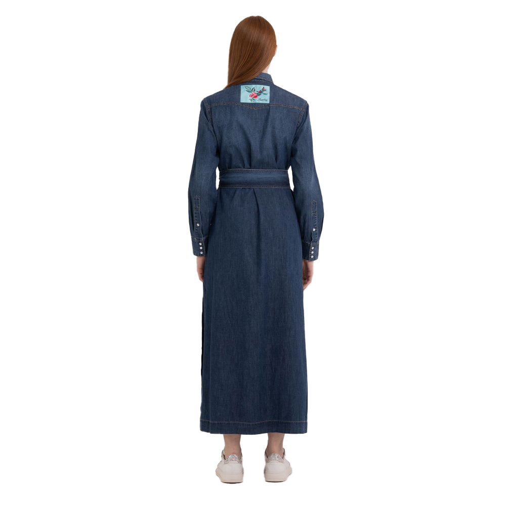 Long shirt-dress made of 7 oz deep blue organic cotton denim. The garment is characterized by the western yoke at the front and at the back. The item with side slits is enhanced by the two flap pockets on the chest and the two vertical pockets at the front. Fastening with press studs and belt tied at the waist.