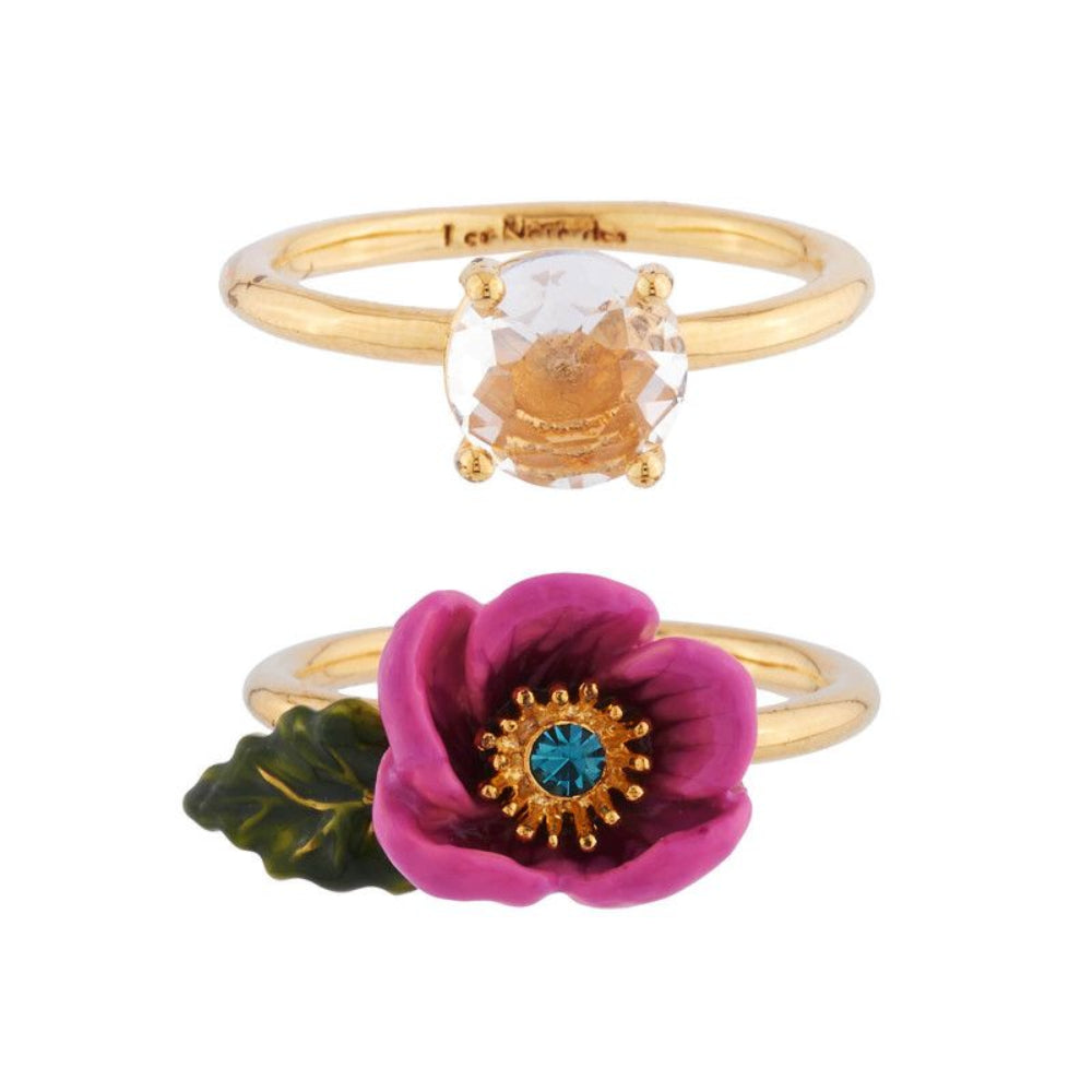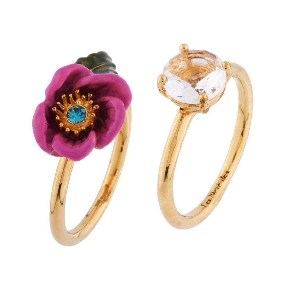 اكتشف زهرة وردية مع مدقة من حجر الراين ومجموعة زجاجية من حلقتين! هذا الخاتم المزدوج مصنوع من النحاس الأصفر المطلي بالذهب عيار ١٤ قيراط. هذه القطعة من المجوهرات للمرأة مزينة بشكل رائع بأحجار الراين والزجاج ذو الأوجه اليدوية. تصميم نقي وفريد ​​من صنع ليه نيريدس باريس