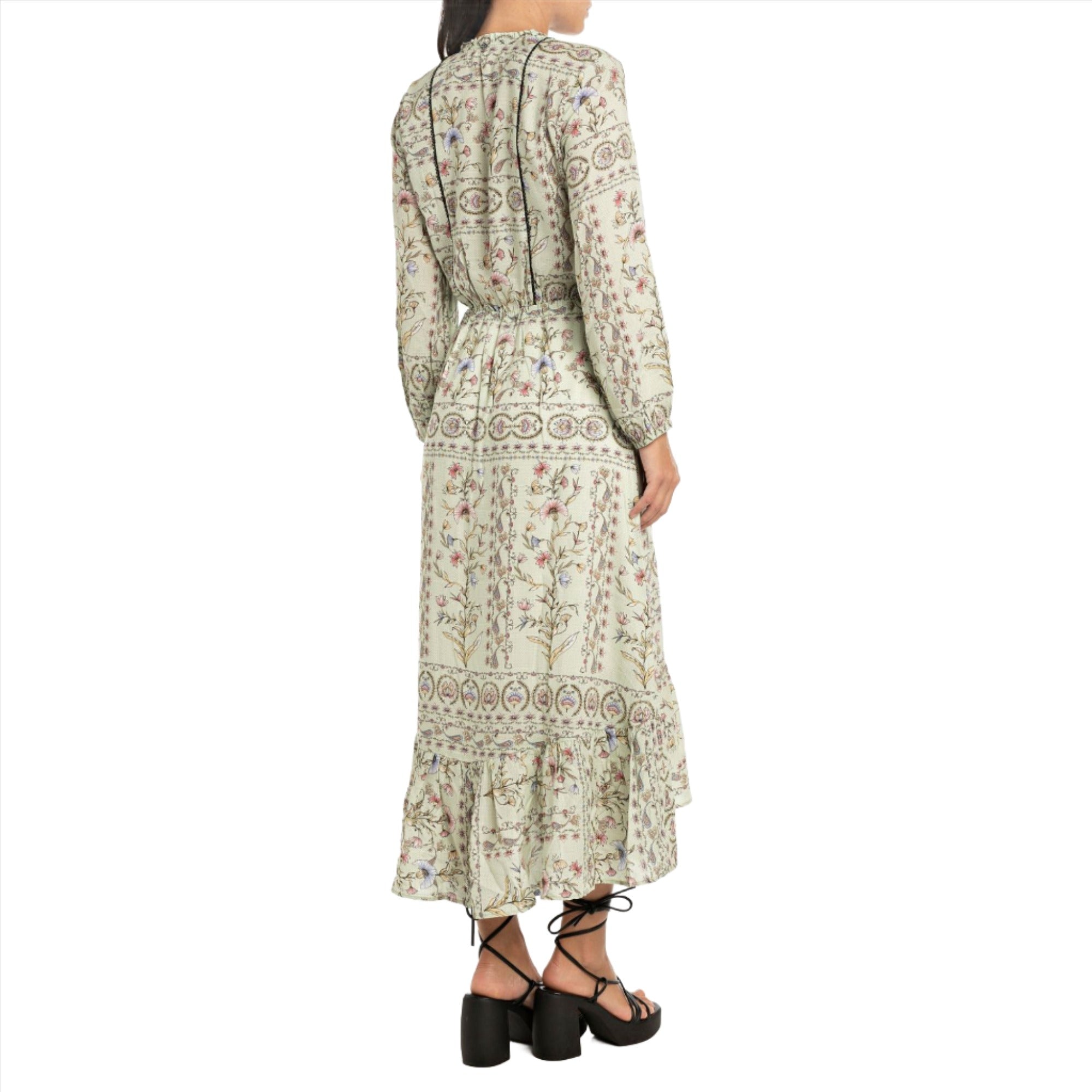 Long dress made of viscose satin with all-over floral print and trimming details. With long puffed sleeves, the garment is characterized by the pencil skirt with frill at the hem. The item is refined by the ruffles around the collar and by the V-opening with small buttons at the front.