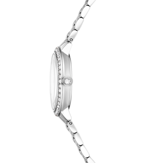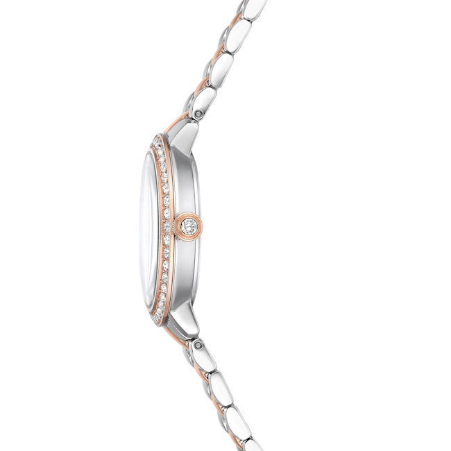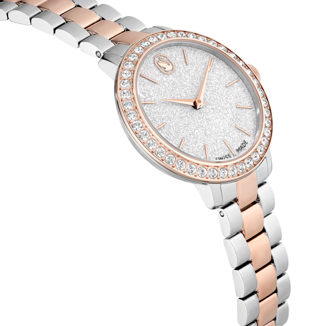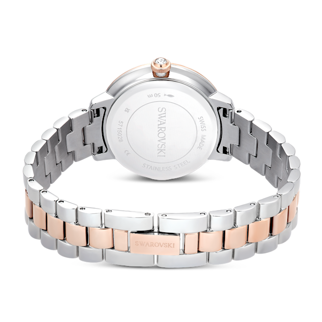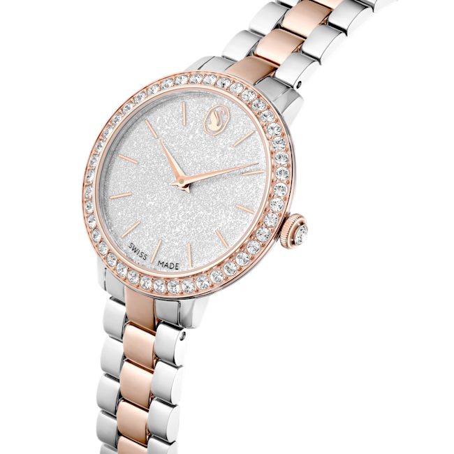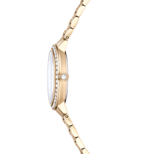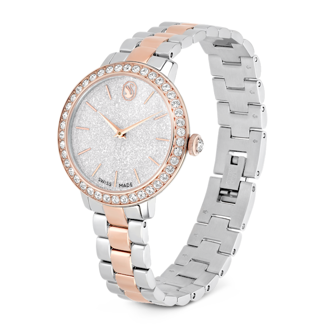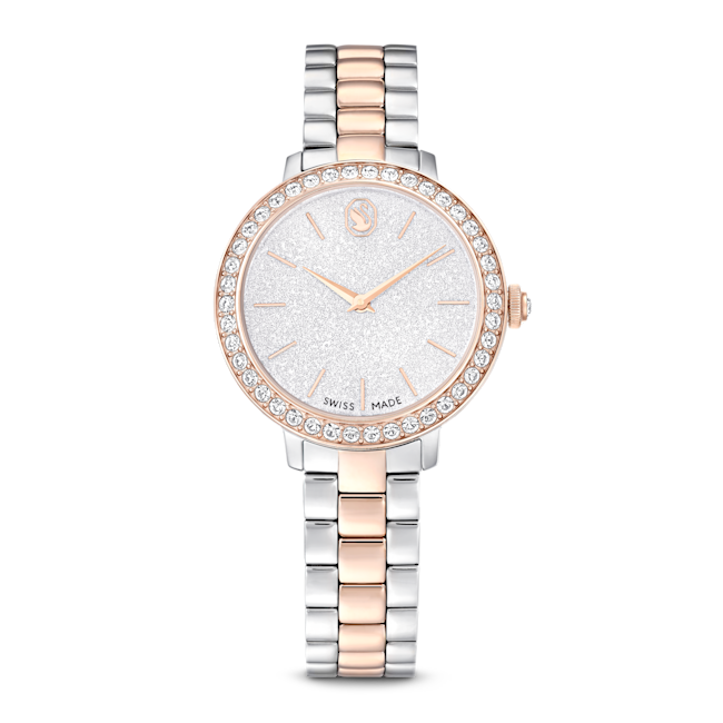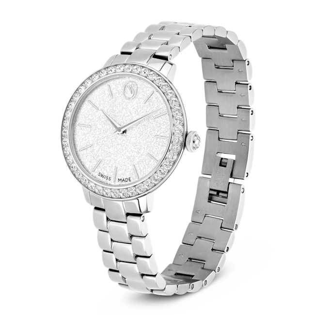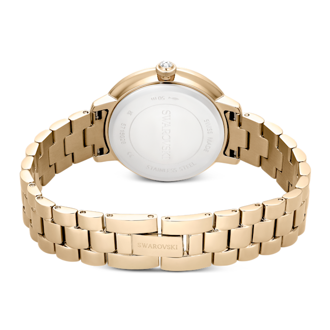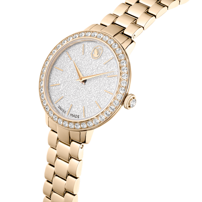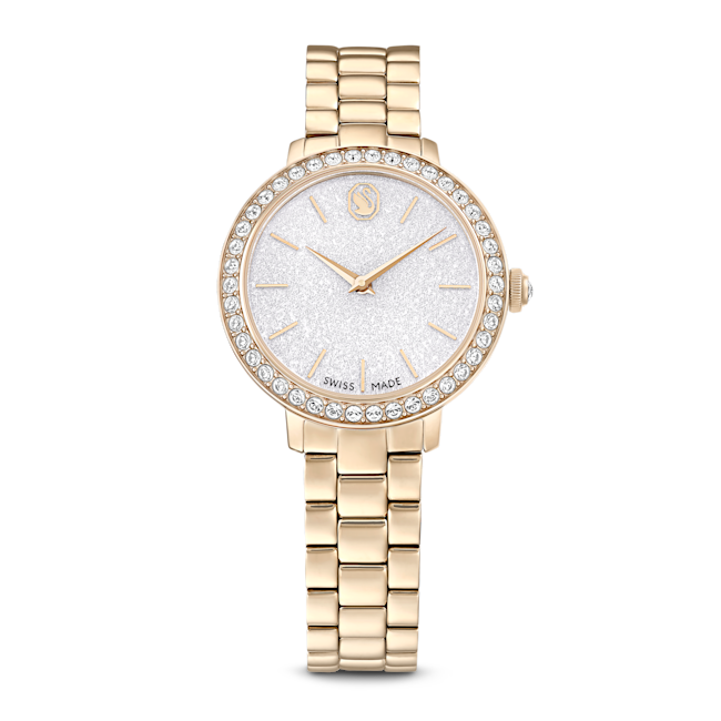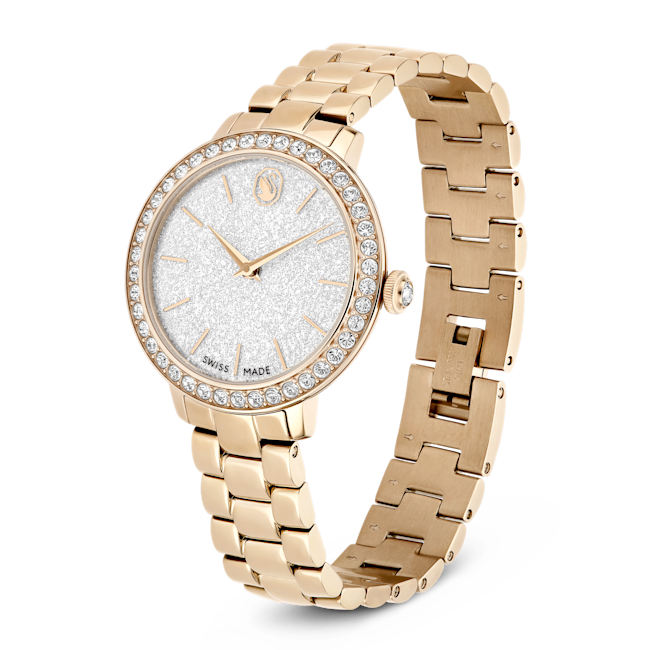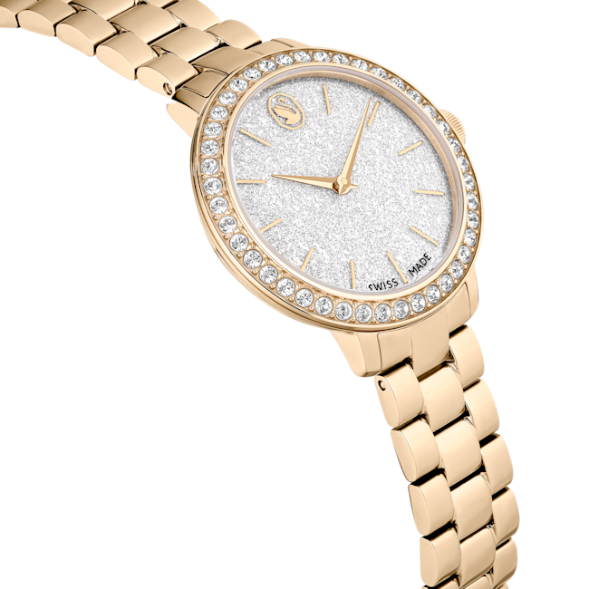 The Swarovski Matrix 3-Link Watch Swiss Made Metal Bracelet is a striking timepiece that embodies contemporary elegance, taking inspiration from Swarovski’s renowned Matrix jewellery collection. This 30 mm watch is masterfully crafted with a champagne gold-tone finished stainless steel, giving it a luxurious yet modern flair. Its distinctive pavé bezel is set with 42 sparkling crystals, enhancing the overall radiance of the watch. The round dial features a glitter effect, complemented by slender hour markers and hands, while the iconic Swarovski swan logo is prominently displayed at the 12 o’clock position. An additional crystal is set within the crown, adding a subtle touch of sophistication. The three-link bracelet is designed to glide gracefully around the wrist, ensuring both comfort and style. Swiss Made and water-resistant up to 50 meters, this watch is not only a precision timepiece but also a versatile accessory, making it the perfect companion for any occasion.