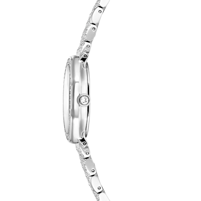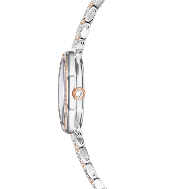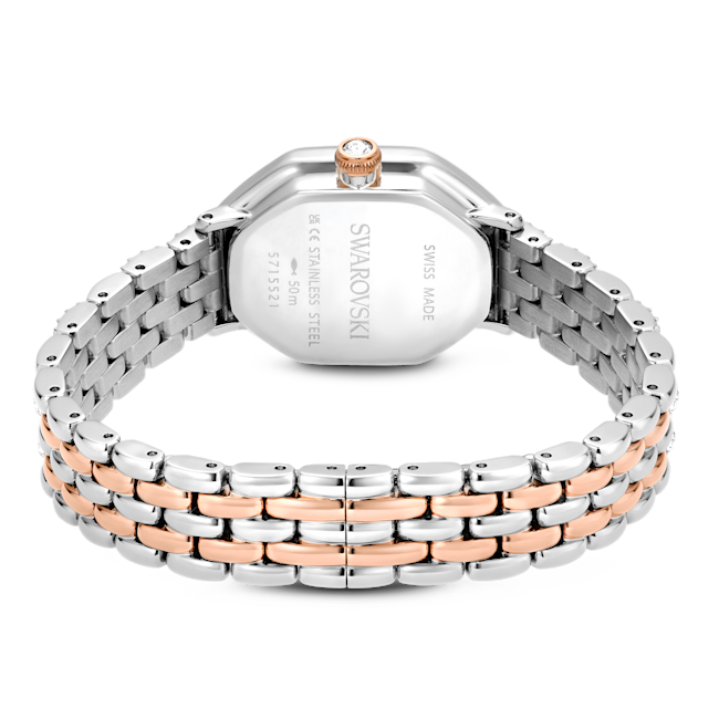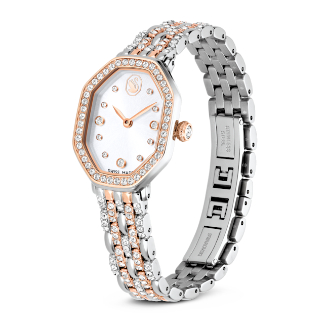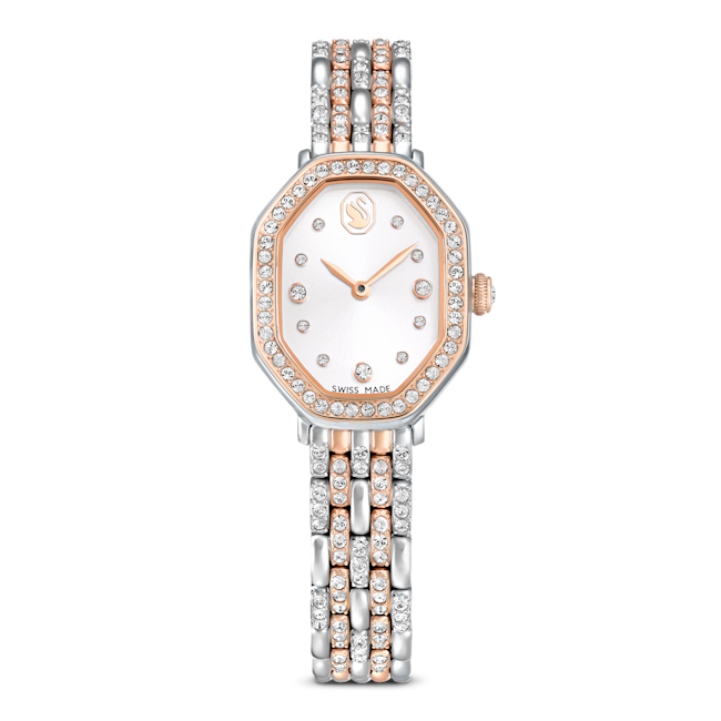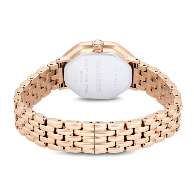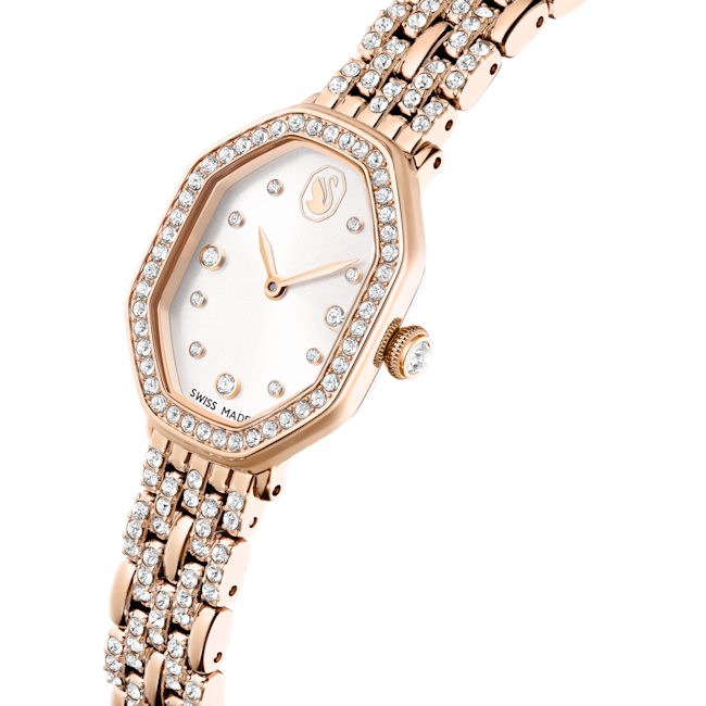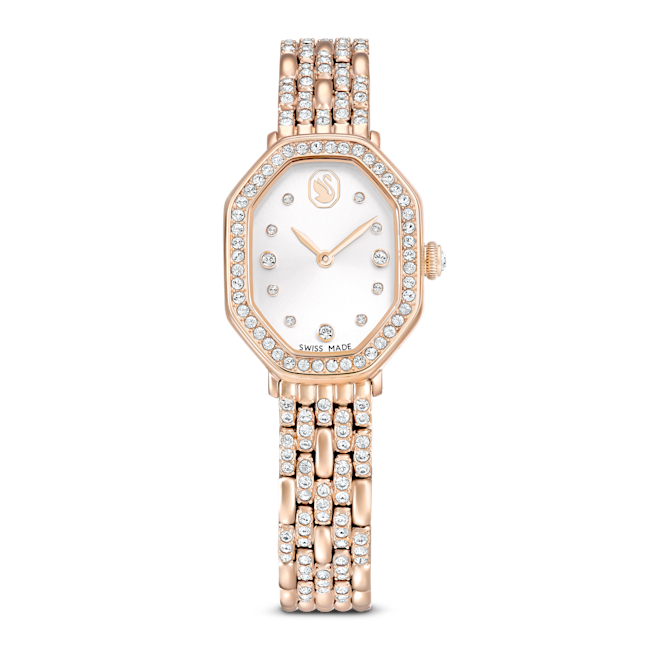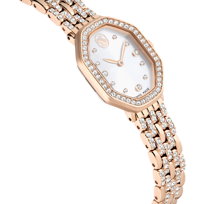 The Swarovski Dextera Octagon Watch epitomizes sophisticated luxury and contemporary design, drawing inspiration from the renowned Dextera family. Expertly crafted in Switzerland, this striking 18 x 23 mm timepiece stands out with its unique octagon-shaped case, a hallmark of Swarovski’s innovation. The stainless steel case is finished in an elegant rose gold-tone, perfectly complementing the sparkling pavé bezel adorned with 46 brilliant crystals, while a single crystal set within the crown adds a touch of refined glamour. The sunray dial radiates timeless elegance, featuring delicate crystal indexes, sleek hands, and the iconic Swarovski swan logo at 12 o’clock. Enhancing its allure, the five-link bracelet shimmers with 108 round-cut crystals, ensuring a dazzling appeal from every angle. With Swiss Made precision and water resistance up to 50 metres, the Dextera Octagon Watch blends aesthetic brilliance with impeccable functionality, making it a radiant accessory for any occasion.