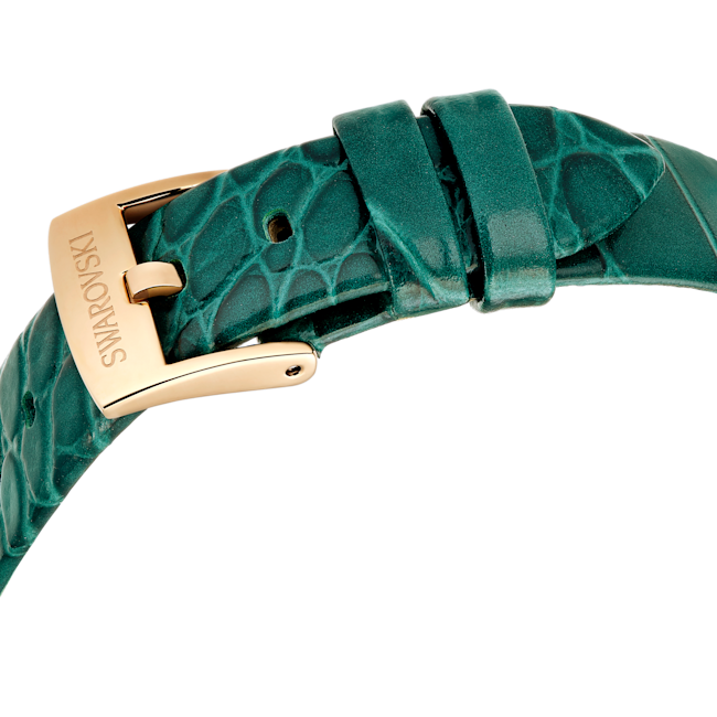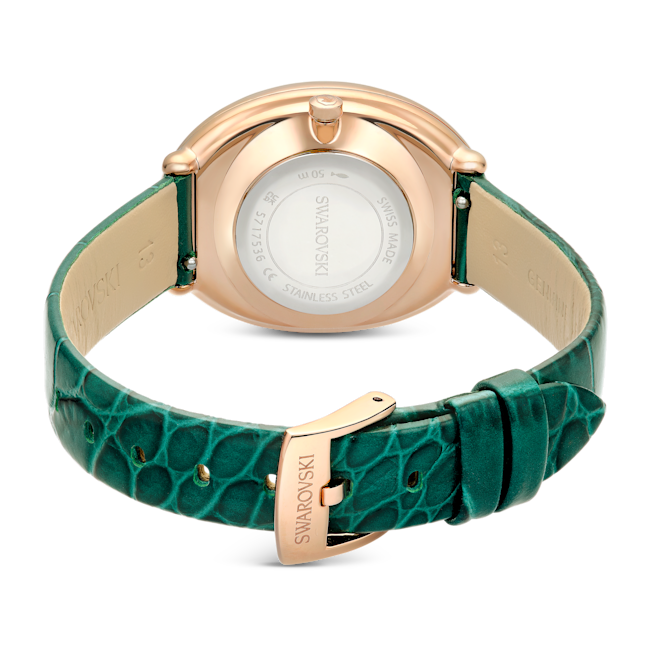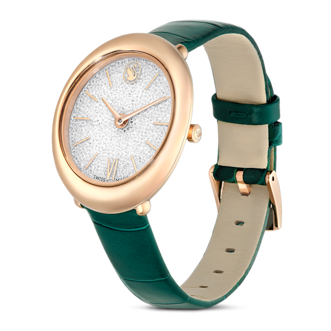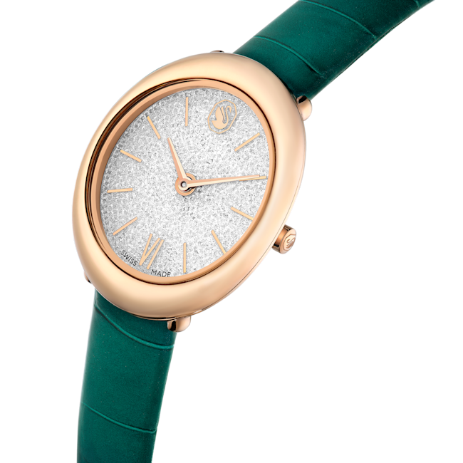 The Swarovski Imber Oval Watch Swiss Made Leather Strap is a striking blend of contemporary design and classic elegance. Defined by its distinctive elliptical shape, this 24 x 26.3 mm timepiece features a rose gold-tone finished stainless steel case that exudes femininity and sophistication. Its Crystalline dial is truly eye-catching, adorned with approximately 1000 clear crystals that shimmer with every movement. The face is refined yet unique, featuring delicate hour markers with a single Roman numeral at 6 o’clock and the iconic Swarovski swan at 12 o’clock, adding a touch of heritage and luxury. Completing the look is a green leather strap with a crocodile-embossed texture, which provides both comfort and a chic, modern flair. Made in Switzerland for superior craftsmanship, the Imber watch is also water-resistant up to 50 meters, making it as practical as it is beautiful. Perfect for elevating any outfit, this watch serves as an impeccable accessory for sophisticated styling from day to night.