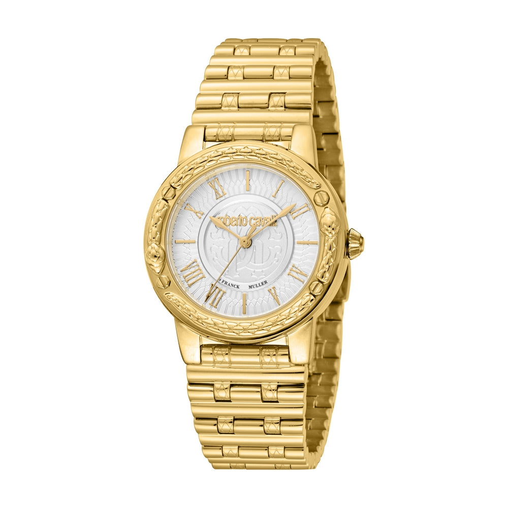 Add a touch of opulent elegance to your look with the Roberto Cavalli by Franck Muller Women's RV1L188M0231 watch. This luxurious timepiece features a gold-tone stainless steel bracelet and a matching case. The white dial is adorned with Roman numeral markers and the Roberto Cavalli logo at the center, creating a regal and refined look. The signature Franck Muller branding is subtly displayed at the bottom of the dial. Powered by a reliable quartz movement, this watch offers accurate timekeeping and a touch of timeless glamour.