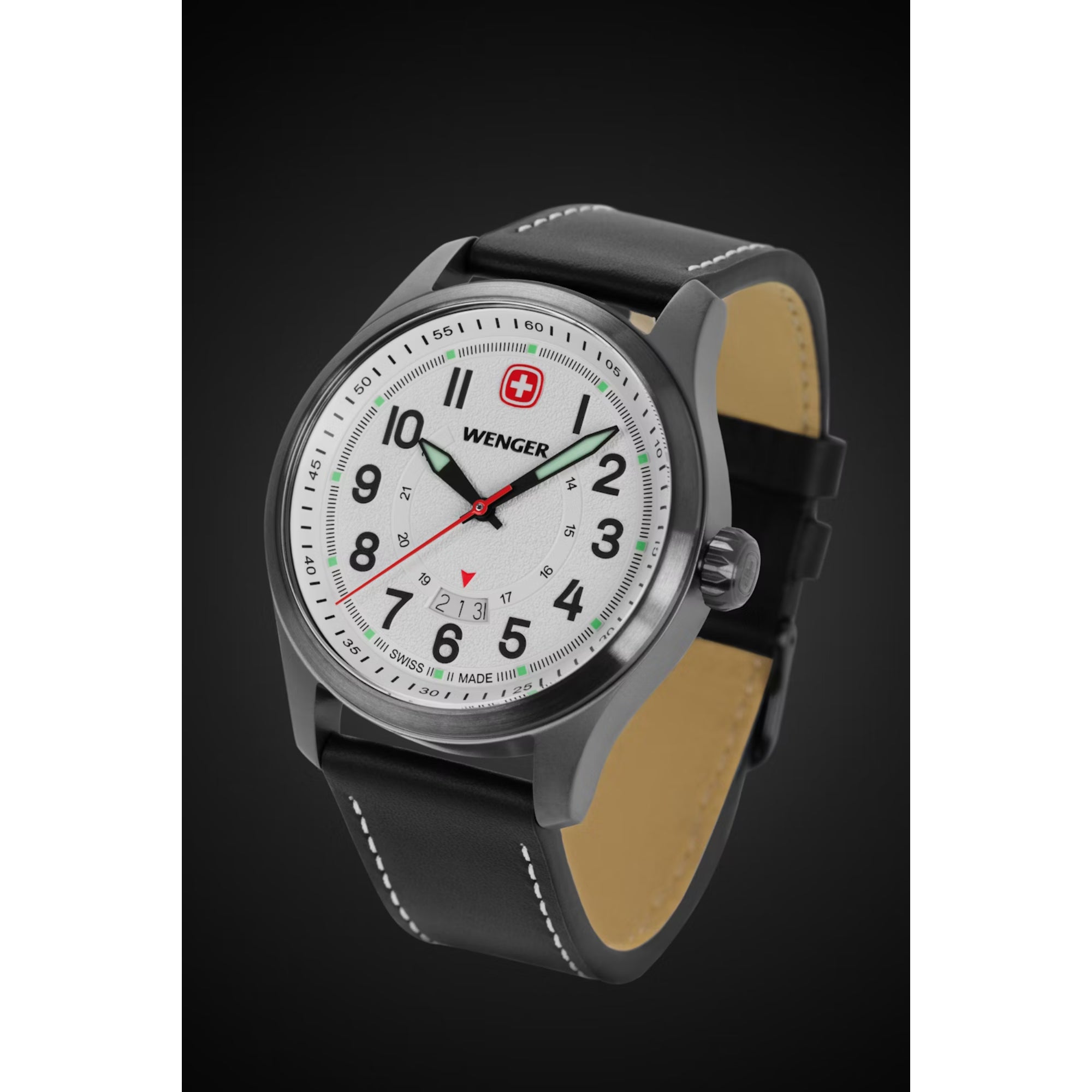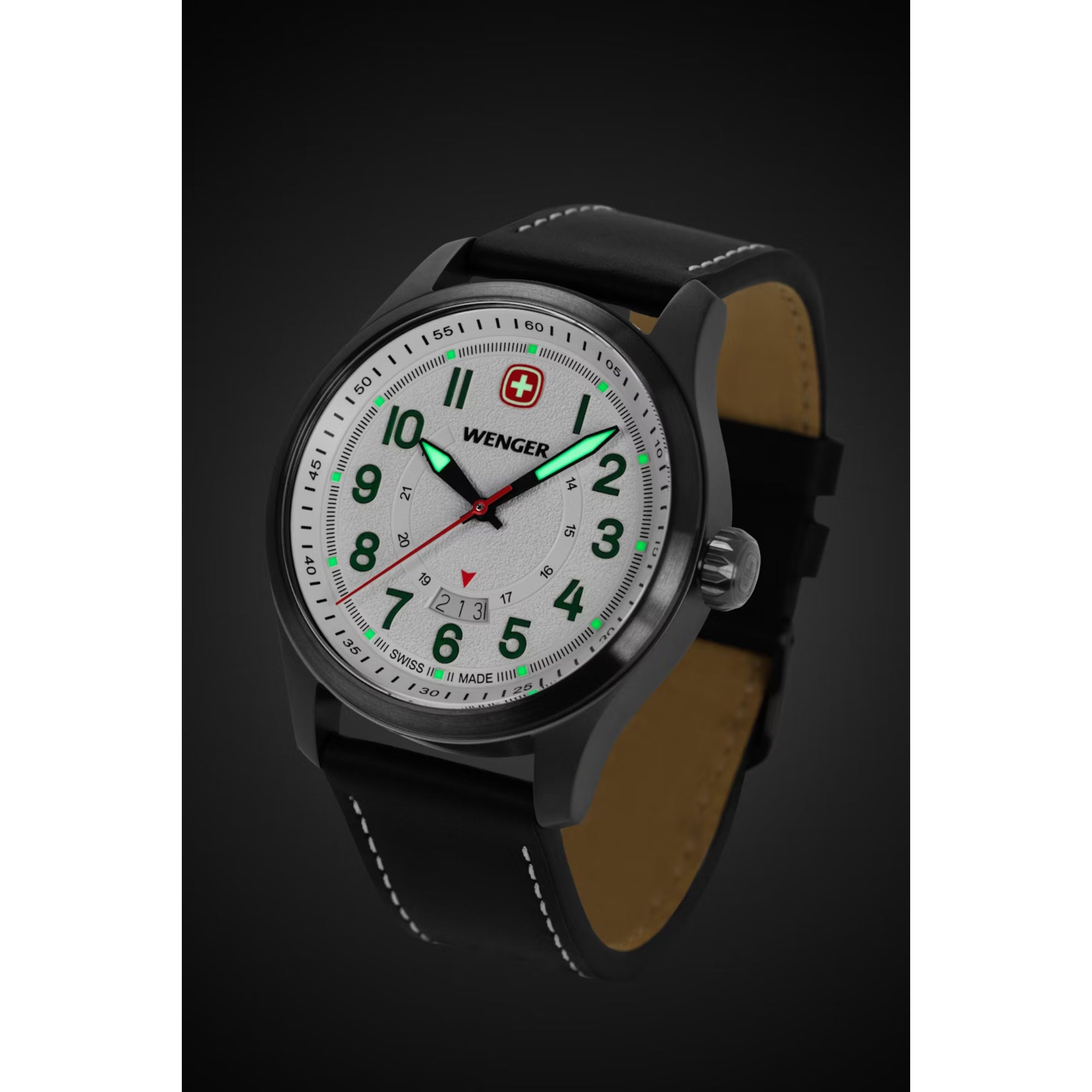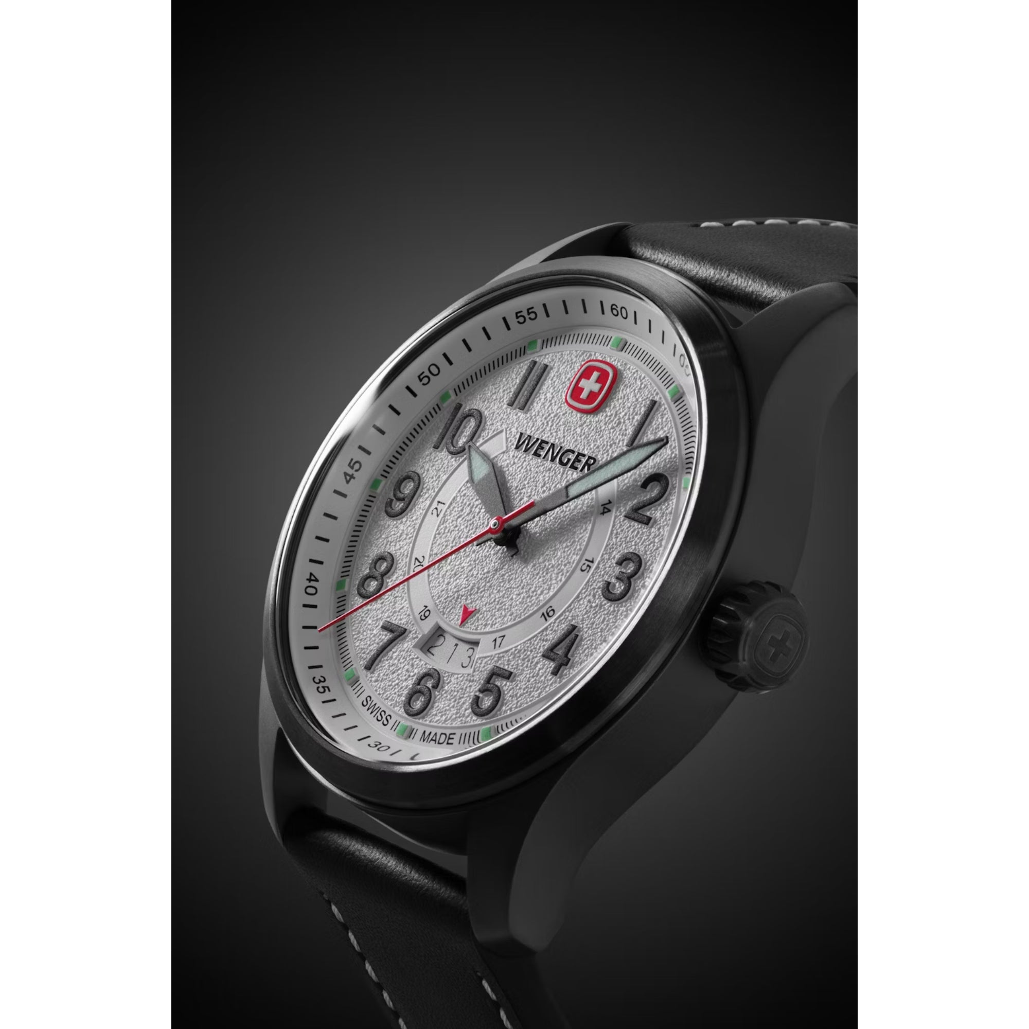 • Super-Luminova® coated numerals, hands, hour markers and Wenger cross, plus a Swiss-red second hand, ensure readability in any situation