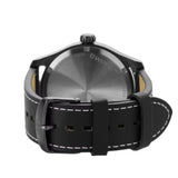 Boldly fashionable and precise, its stainless-steel case, caseback, and knurled crown exemplify its durability and attention to detail, while a black genuine leather strap, adorned with classic white stitching and a stainless-steel buckle, adds a touch of timeless style to this stylish timepiece.