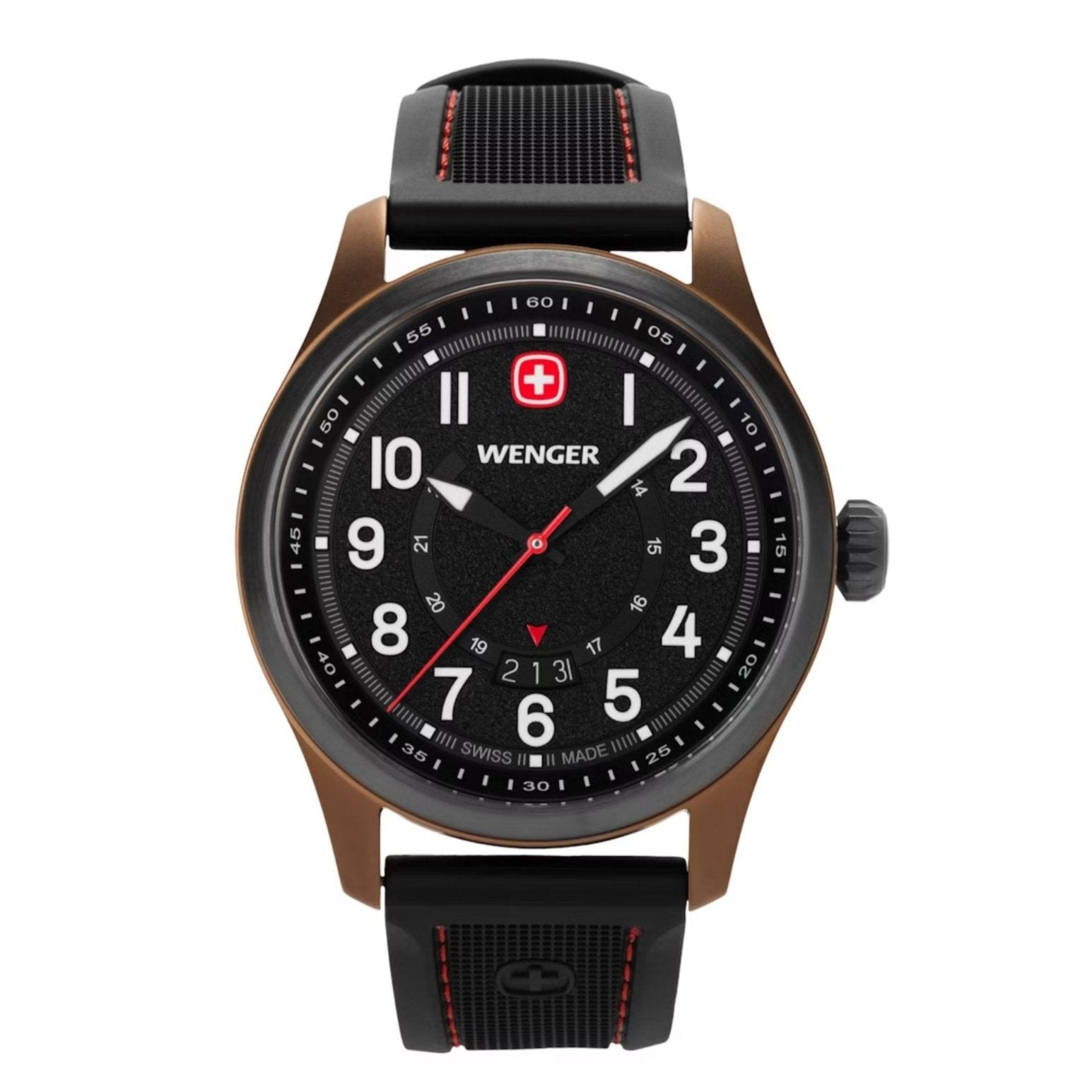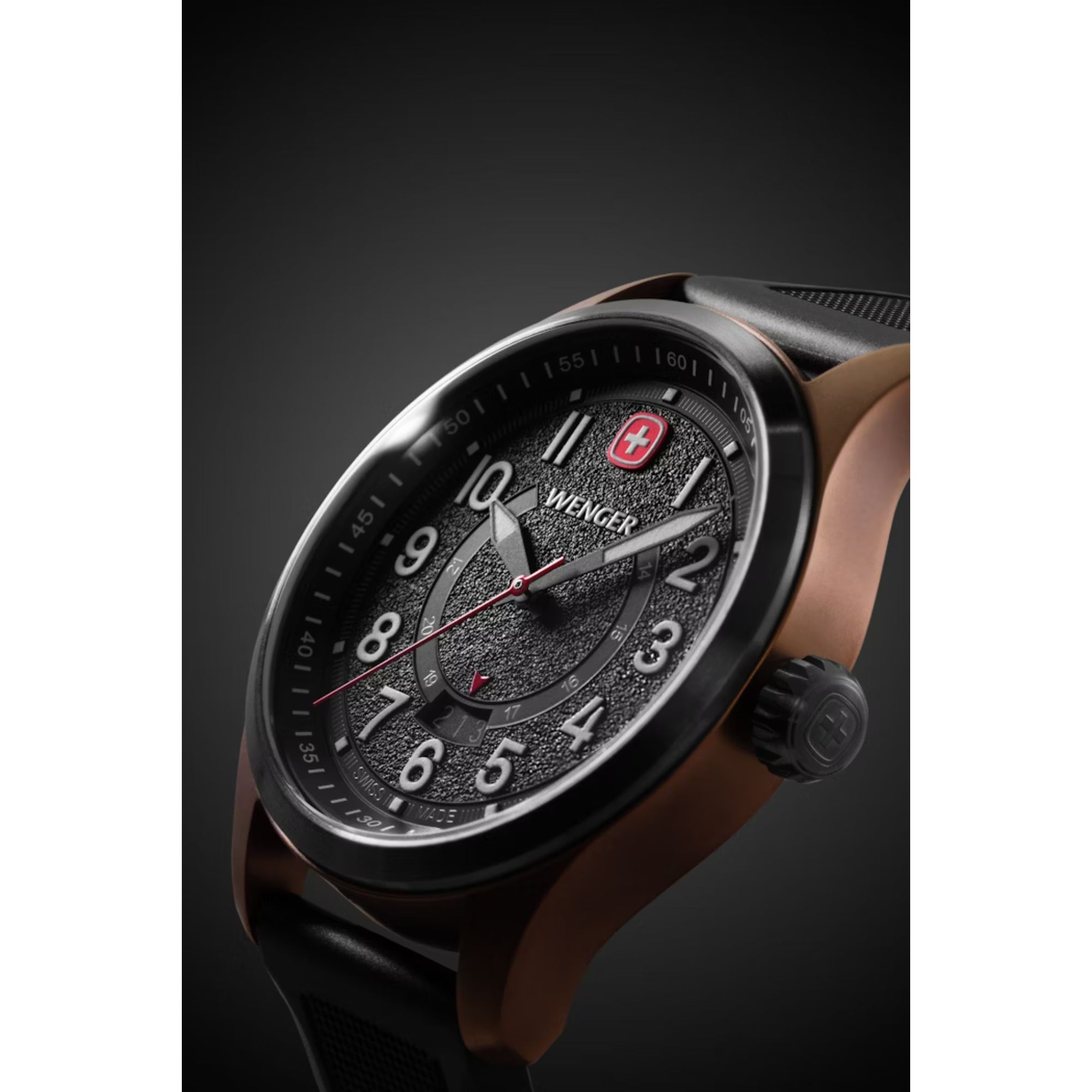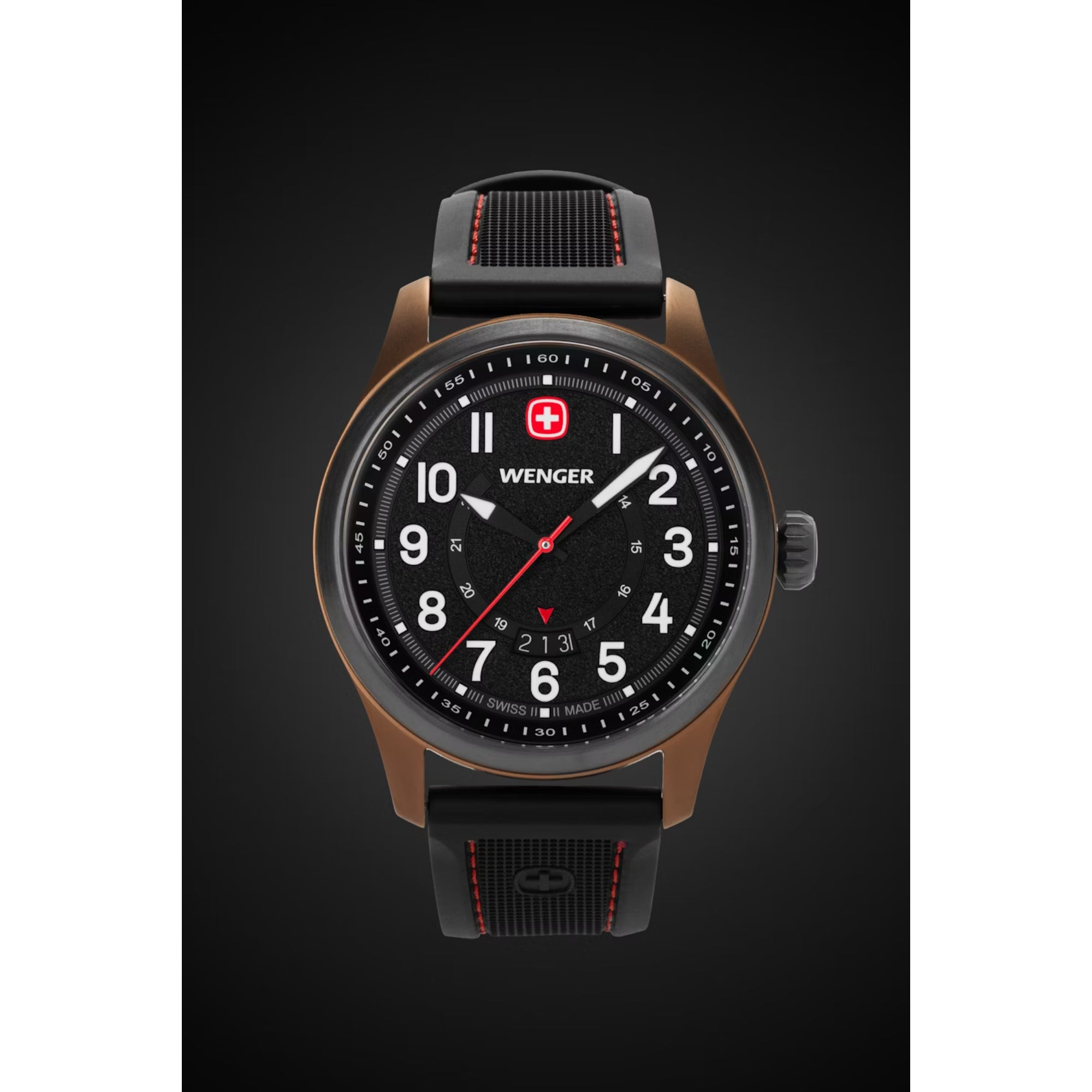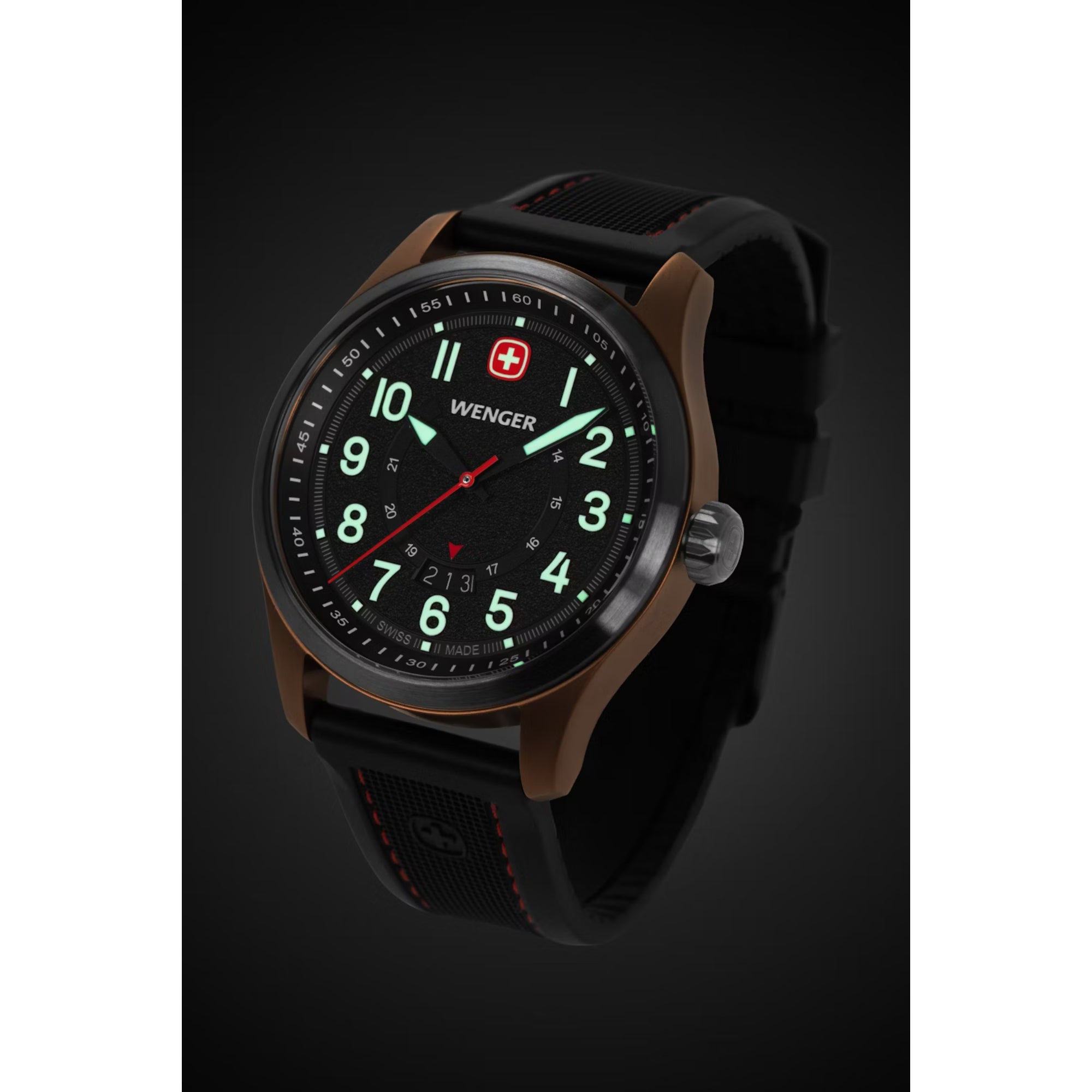 - Super-Luminova® coated numerals, hands, hour markers and Wenger cross, plus a Swiss-red second hand, ensure readability in any situation