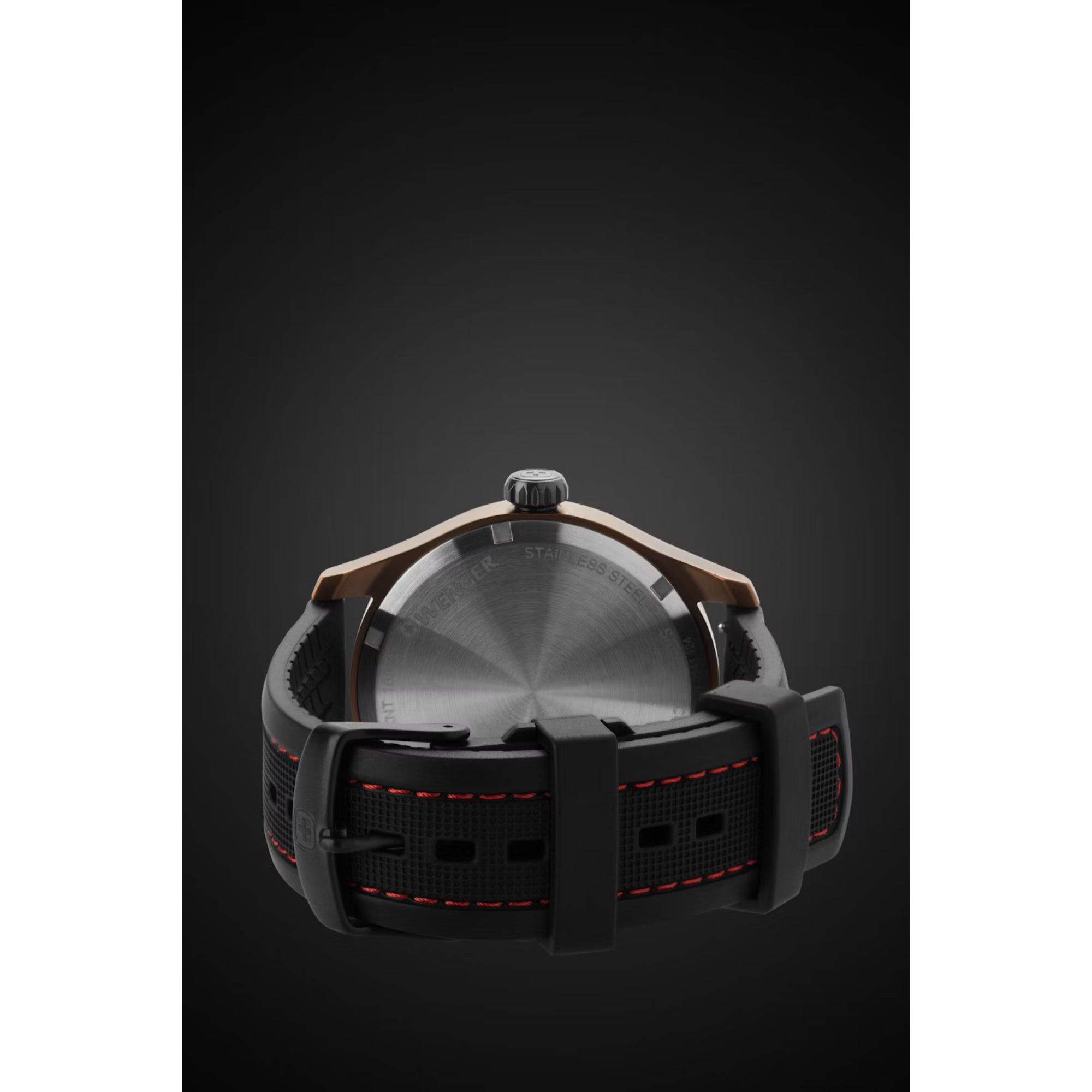 - Sporty silicone bracelet sewn with Swiss-red stitching and fitted with a stainless-steel buckle