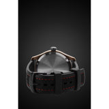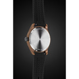 - Classic style black semi-mat dial with generously sized Arabic numerals and a date window, laid within a solid bronze case befitted with a sporty silicone strap