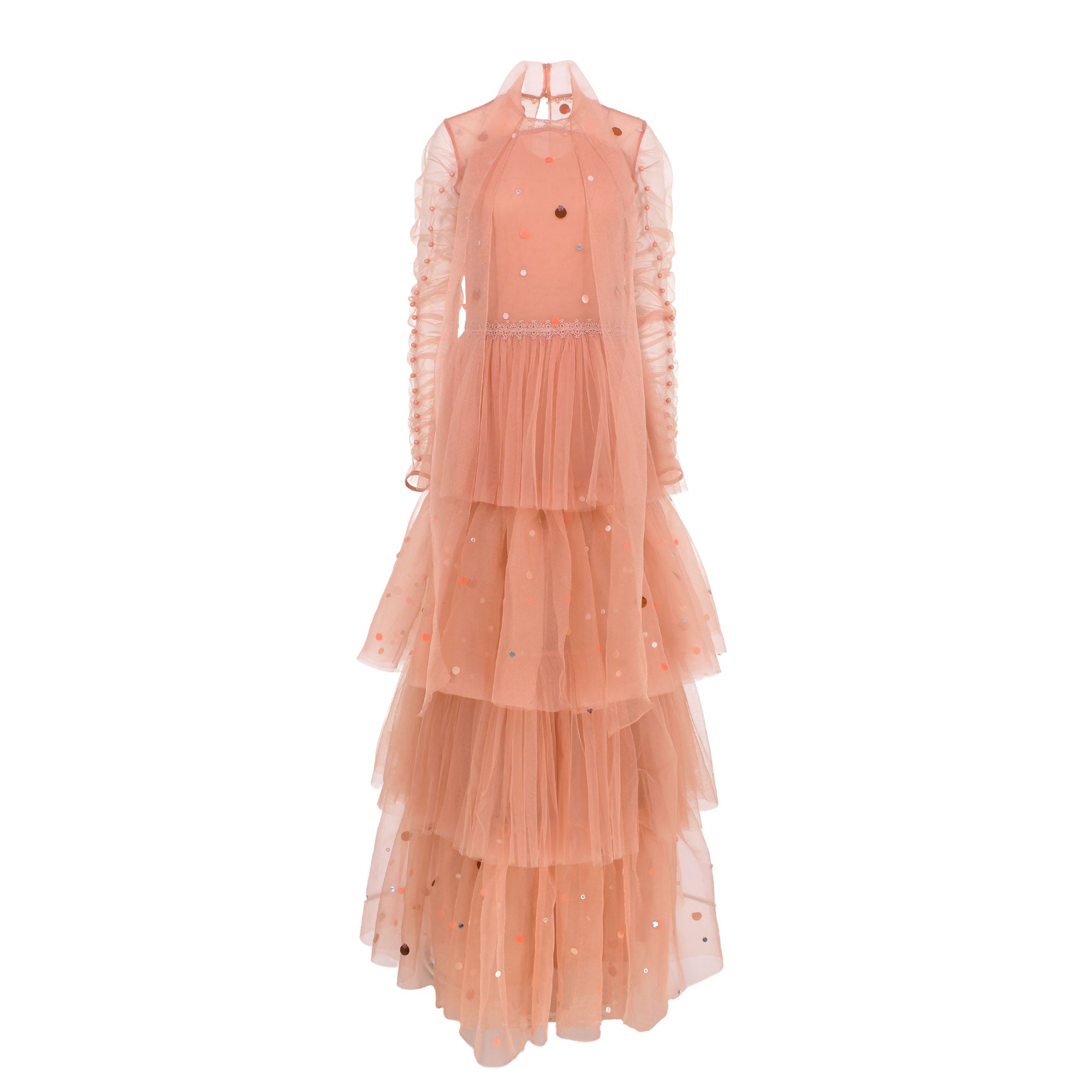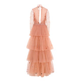 | Supria Munjal's latest tulle gown has gotten a lot of attention for its sophisticated and fashionable look.It has been expertly stitched to enhance your overall appearance. This dress has a round neck in the front and a stand collar in the back, a tulle frill attached to the front, a pleated laced waist, and a back button closure. The fitted bodice leads to ruffled and layered skirt panels that cascade to the floor. The stitch design and beaded sleeves with polka dots on the dress add to the dress's versatility. It's a perfect fit that gives the wearer a refined appearance. SPECIFICATIONS :