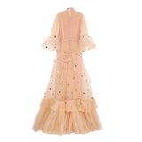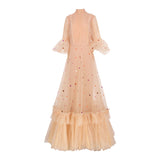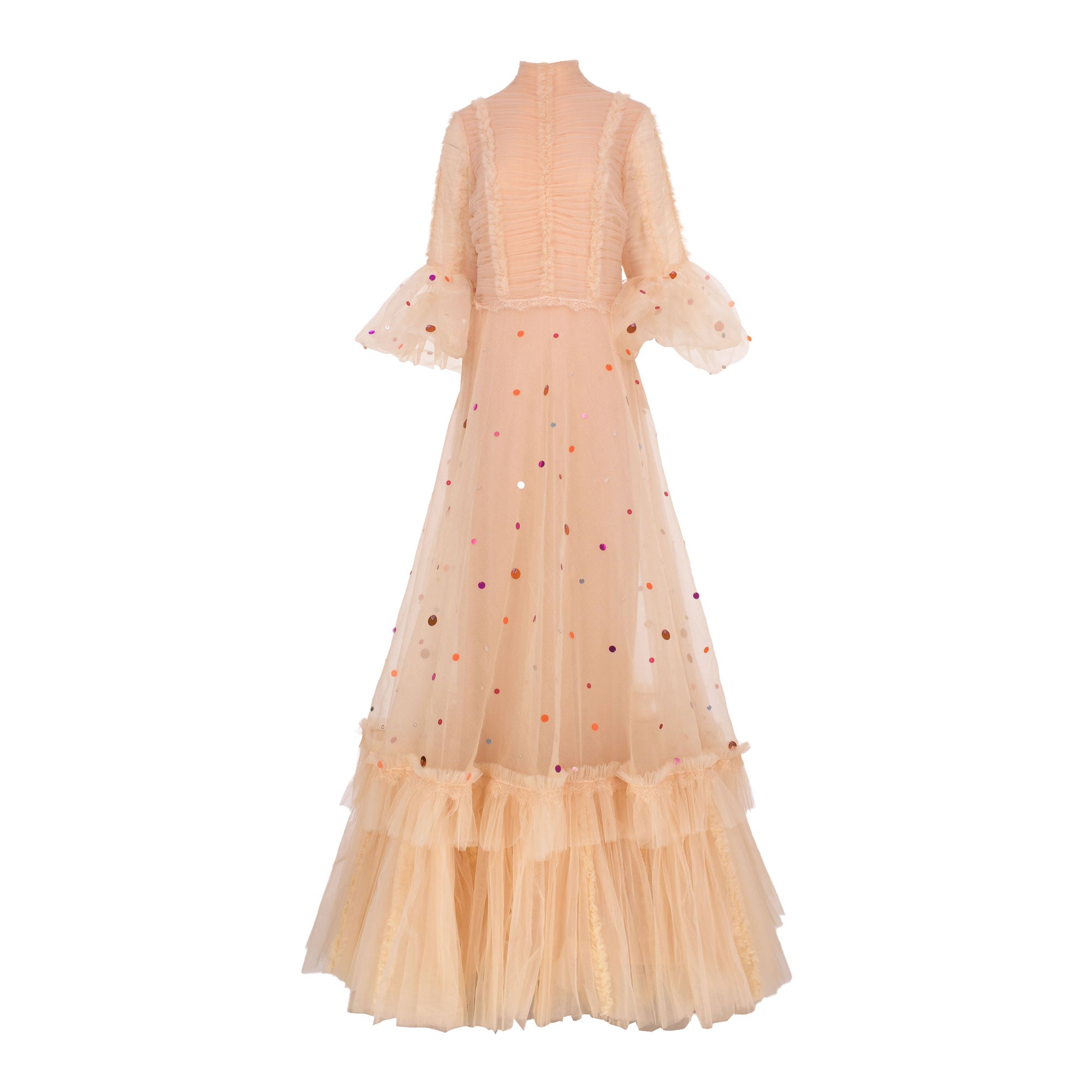 | Supria Munjal's most recent tulle gown has received a lot of attention for its sophisticated and fashionable appearance. It has been expertly stitched to improve your overall look. This dress has long ruffled sleeves and a back zipper closure. The versatility of this dress is enhanced by its gathered front and tiered and frilled bottom. It has multicolored polka dots on it. It's a perfect fit that gives the wearer a sophisticated look. SPECIFICATIONS :