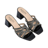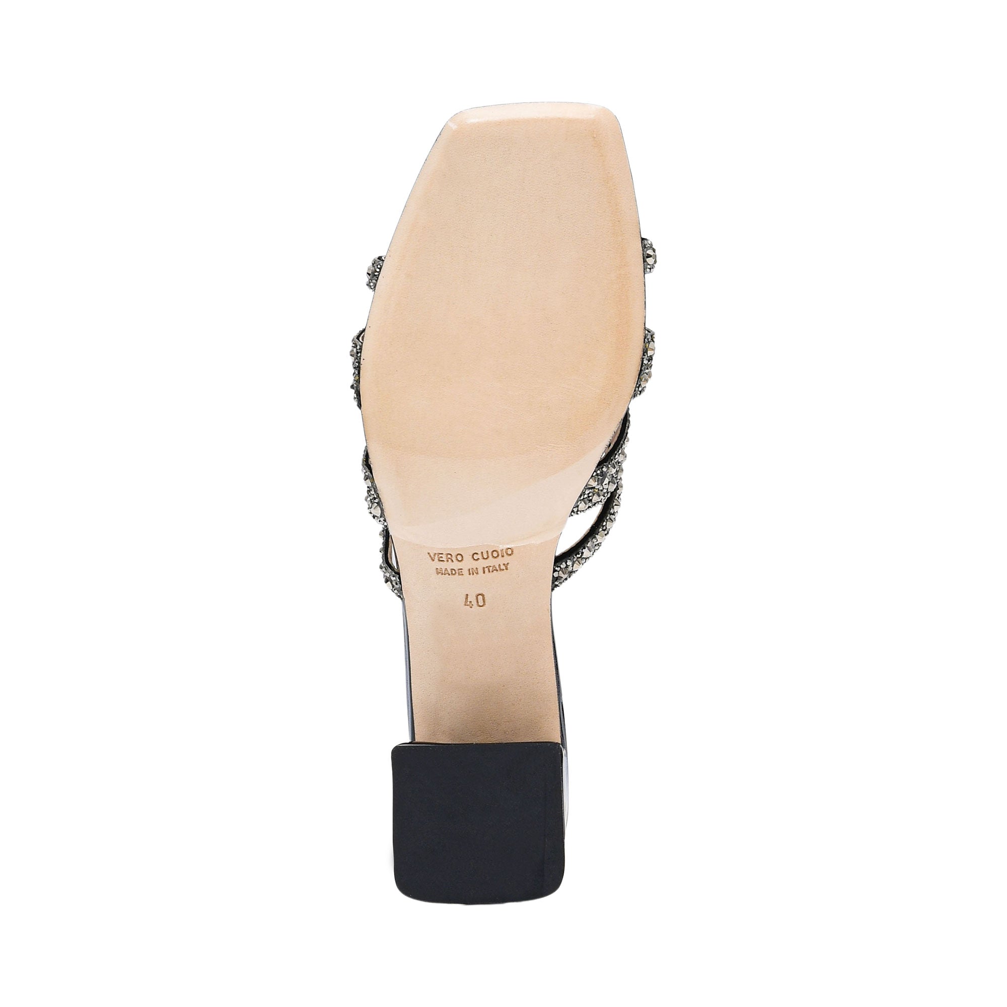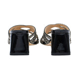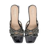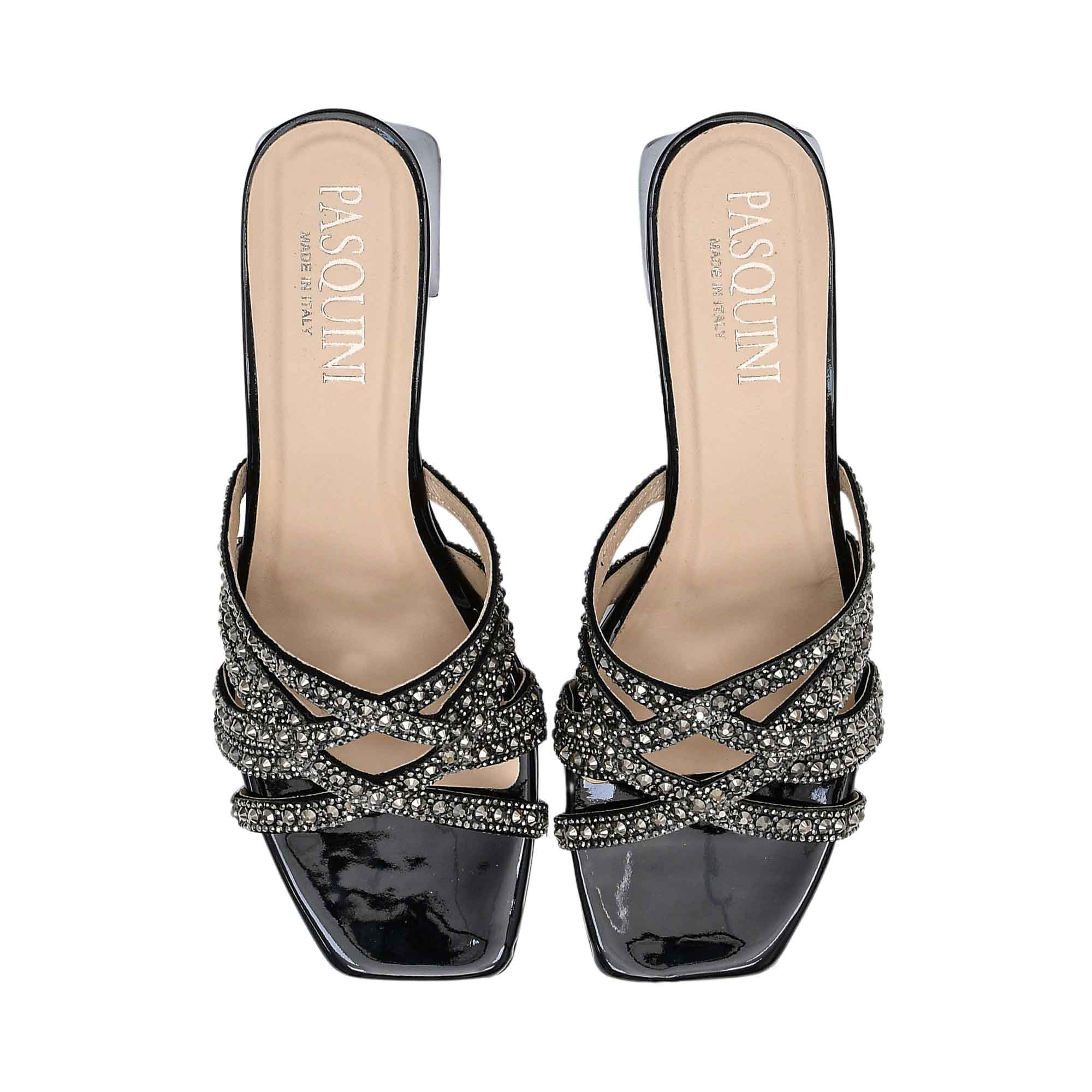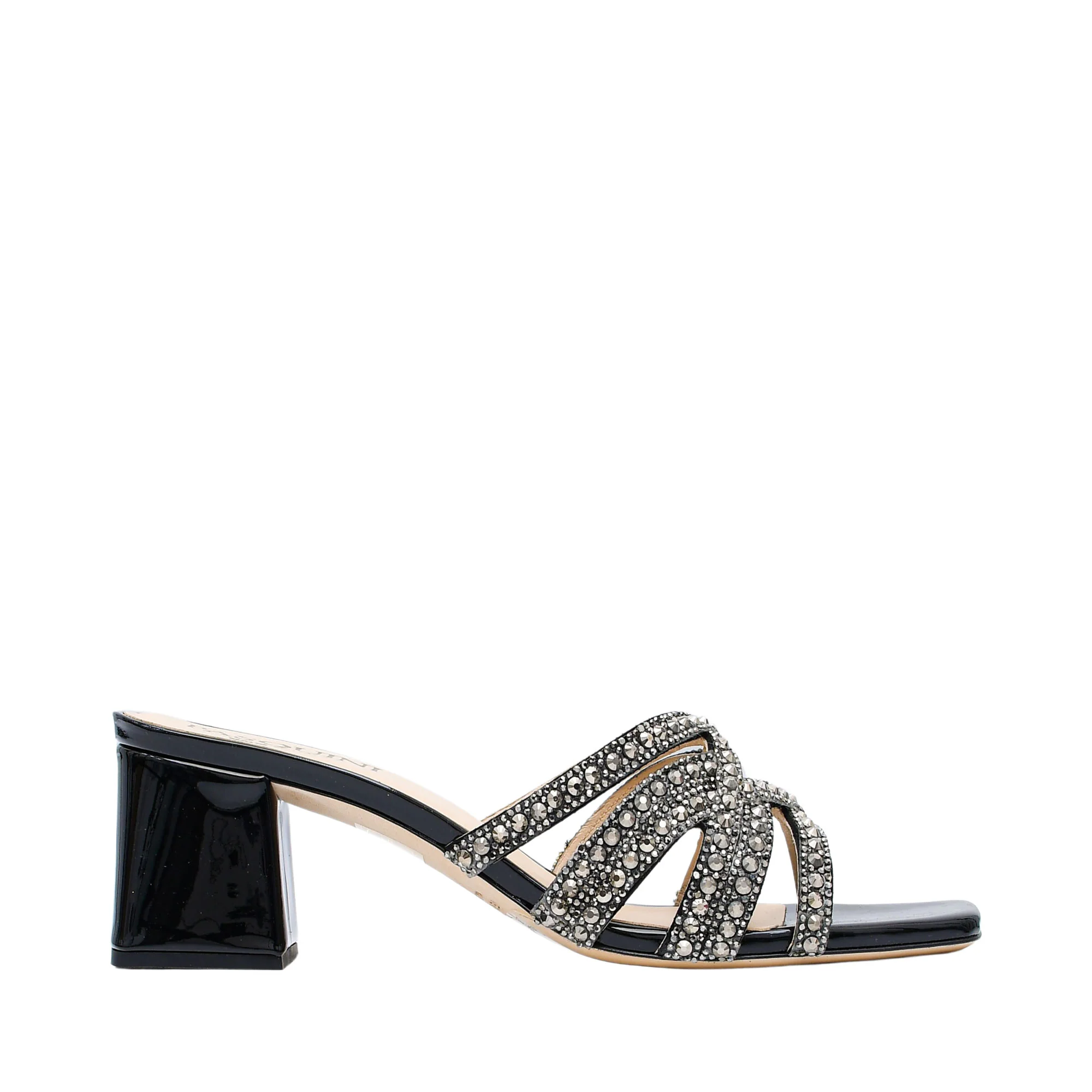 The Pasquini Women's Heel Sandal in Black Patent Leather is a stylish and sophisticated shoe that features a unique design and high-quality materials. The upper is made of black patent leather, giving it a glossy and polished appearance. The sandal also includes intricate hematite stones on the straps, adding a touch of glamour to the shoe. The square open toe design allows for comfort and breathability, making it suitable for all-day wear. The sandals also have a secure fit with an ankle strap and buckle closure. The block heel adds height and stability, making it a versatile option for both formal and casual occasions. The Pasquini Women's Heel Sandal in Black Patent Leather offers a timeless and elegant look that will elevate any outfit. Its combination of style and functionality makes it a must-have for any fashion-forward woman's wardrobe.