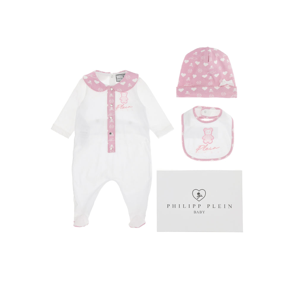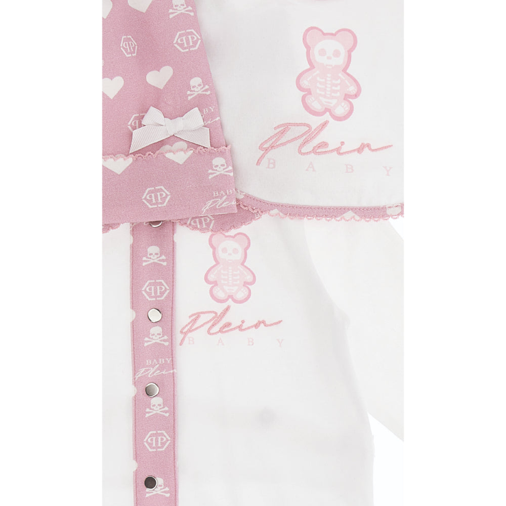 | This Philipp Plein Kids White Set Sleepsuit is an adorable and comfortable sleepwear outfit for the modern day child. Crafted from 100% cotton, it is sure to provide a heavenly night's sleep for your little one. On the front, a bold logo is featured for a lightweight, stylish statement. The peterpan collar, long sleeves, and back popper fastening keep the piece comfortable and secure. Plus, the included pink hat is gorgeously decorated with a pattern design that will make your child look extra cute. And for added convenience, a matching bib is included to keep your little one's clothing mess free. Perfect for a cozy night in or sleepover at grandmas, this Philipp Plein Sleepsuit is sure to become a bedtime favorite! SPECIFICATIONS: