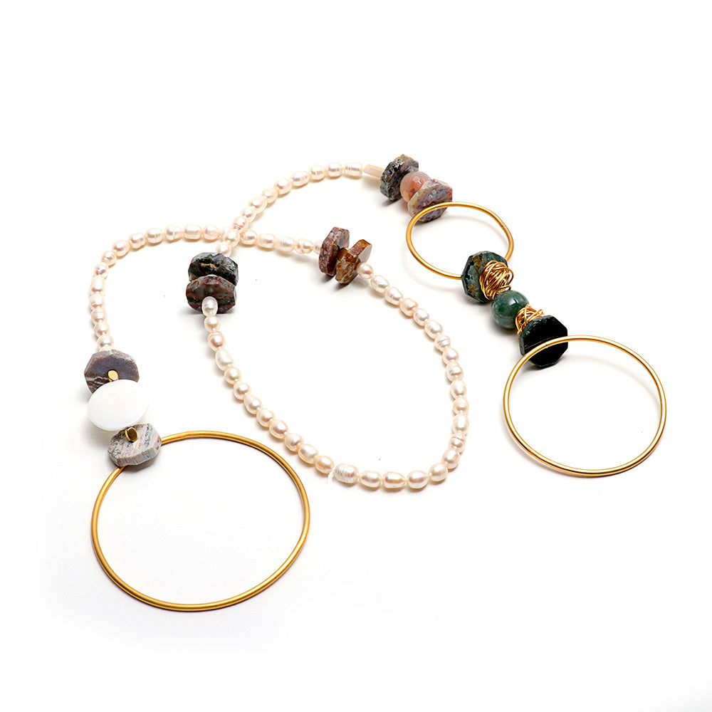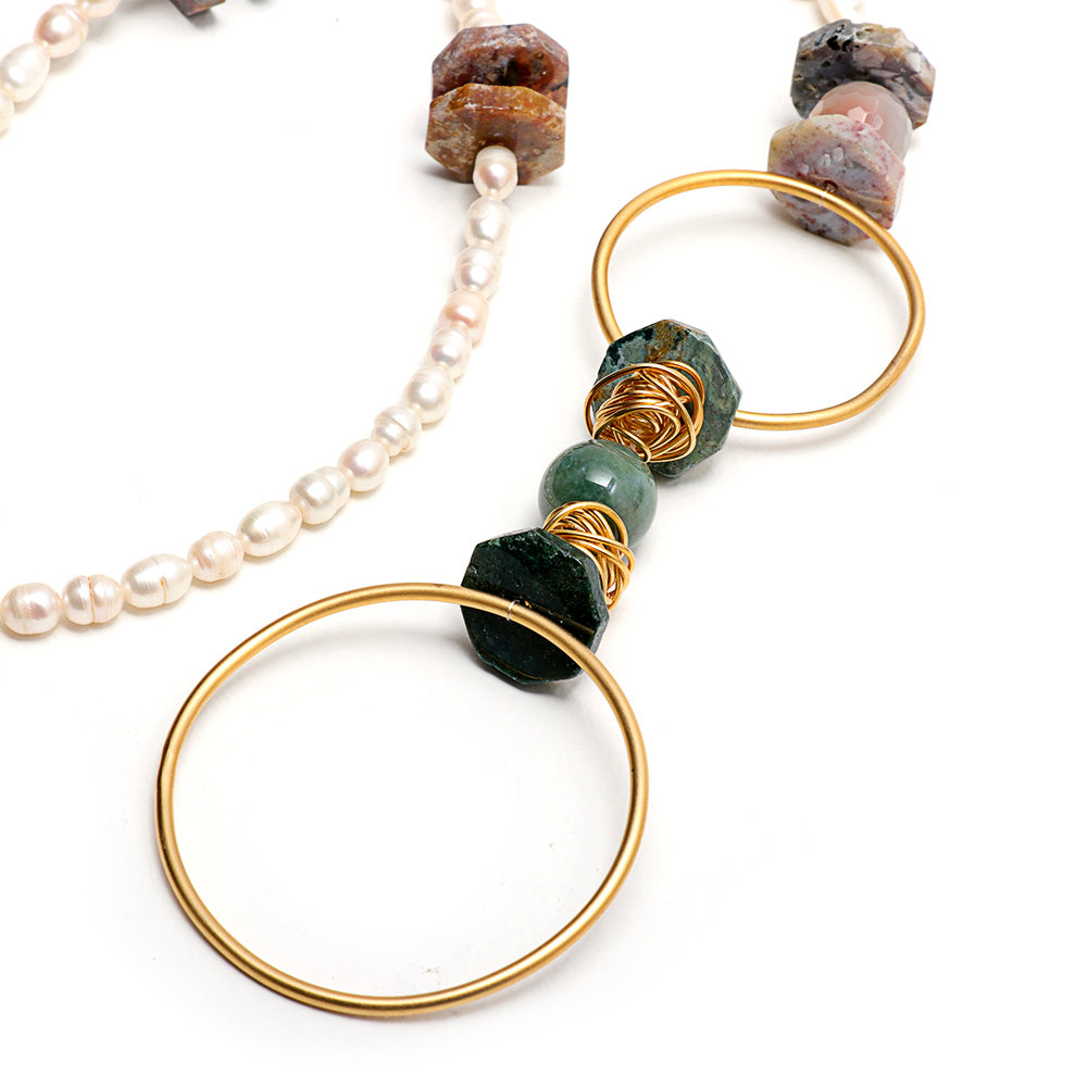 This beautiful Chillout Long Natural Stones Necklace is a simple and classic piece created with natural stones. The basic gold and silver necklace has a wonderful combination of colors, making it the perfect accessory for any outfit. The necklace features various natural stones. Each stone has a unique texture and color. This necklace is made with a high-quality gold plated chain, adding a luxurious touch to the piece. This long necklace can be worn with casual or formal clothing, making it a versatile piece to have in any wardrobe. With just a few simple beads and a delicate chain, this minimalist necklace is a great way to add some subtle elegance to any ensemble.