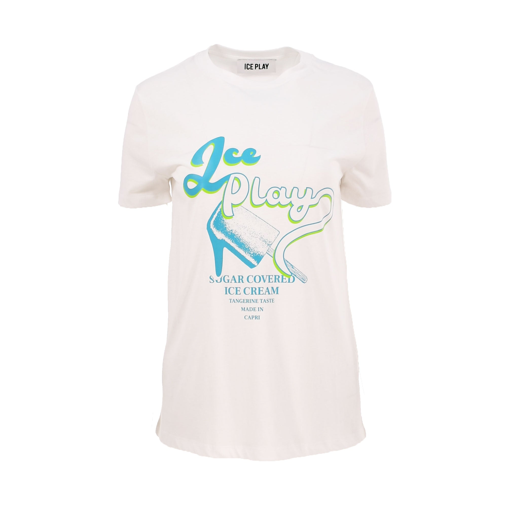 | This Ice Play brand Logo Print T-shirt in White is made from cotton and features a short sleeve design, a crew neck, and an ice cream print at the front of the shirt. It is available in sizes small to large. SPECIFICATION