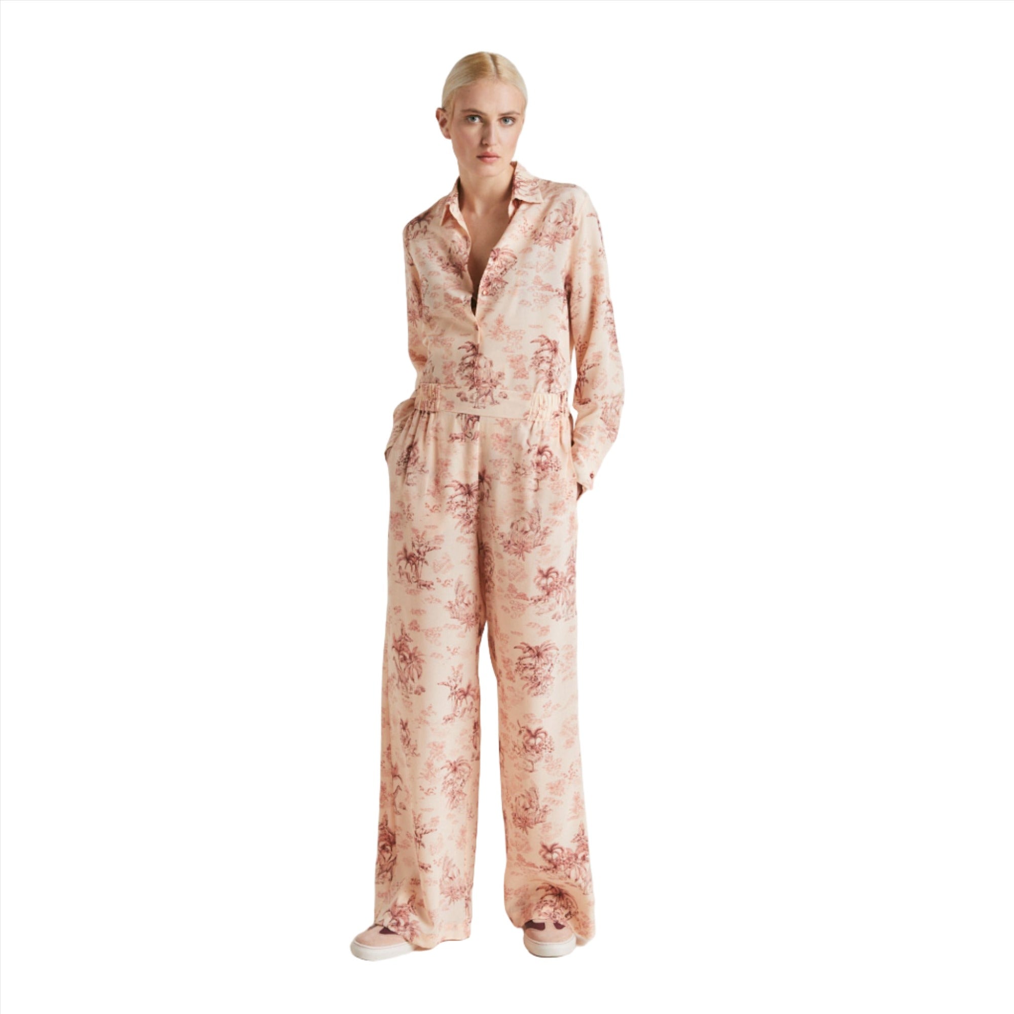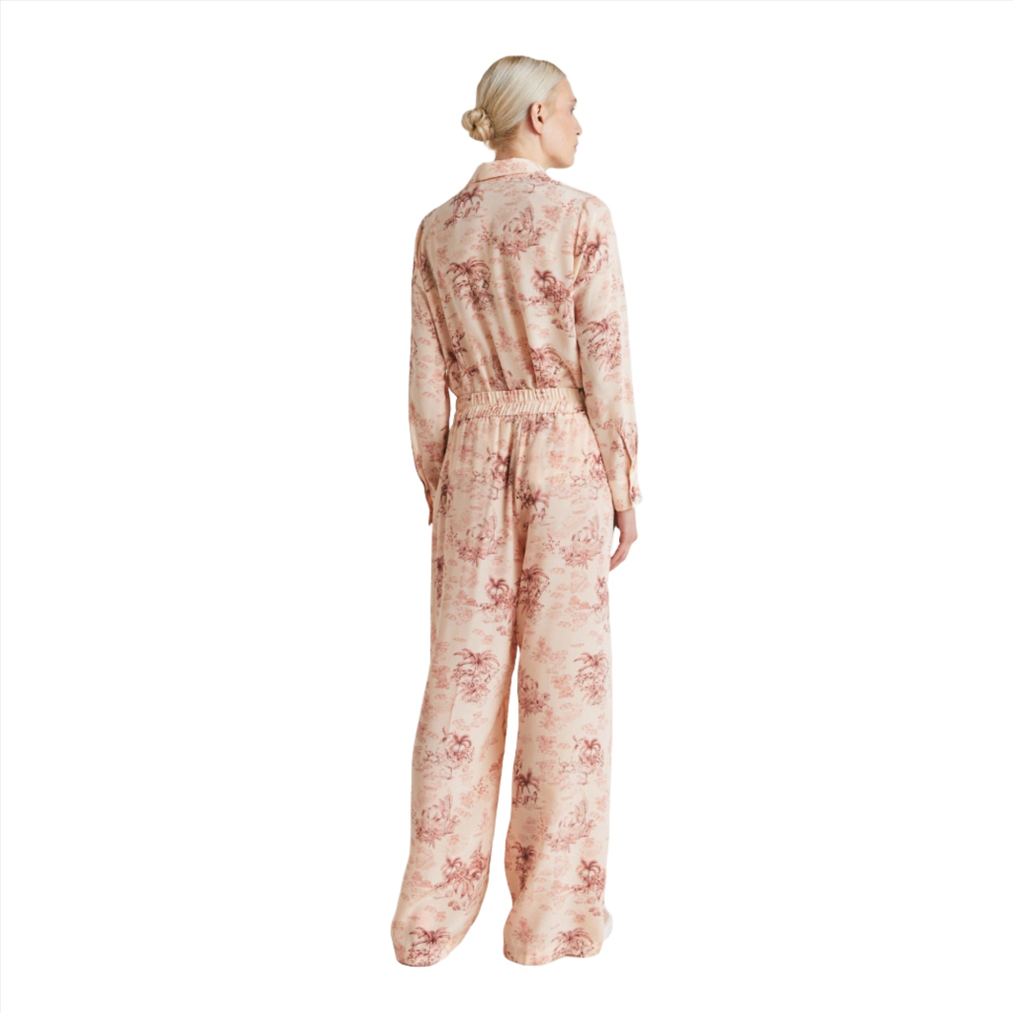 - Wide leg carryover pants in printed silk crêpe de chine. Baccarat's generous volume pairs with the comfort of an elasticated waist for a deluxe pyjama look. Side seam pockets. Made in Italy.