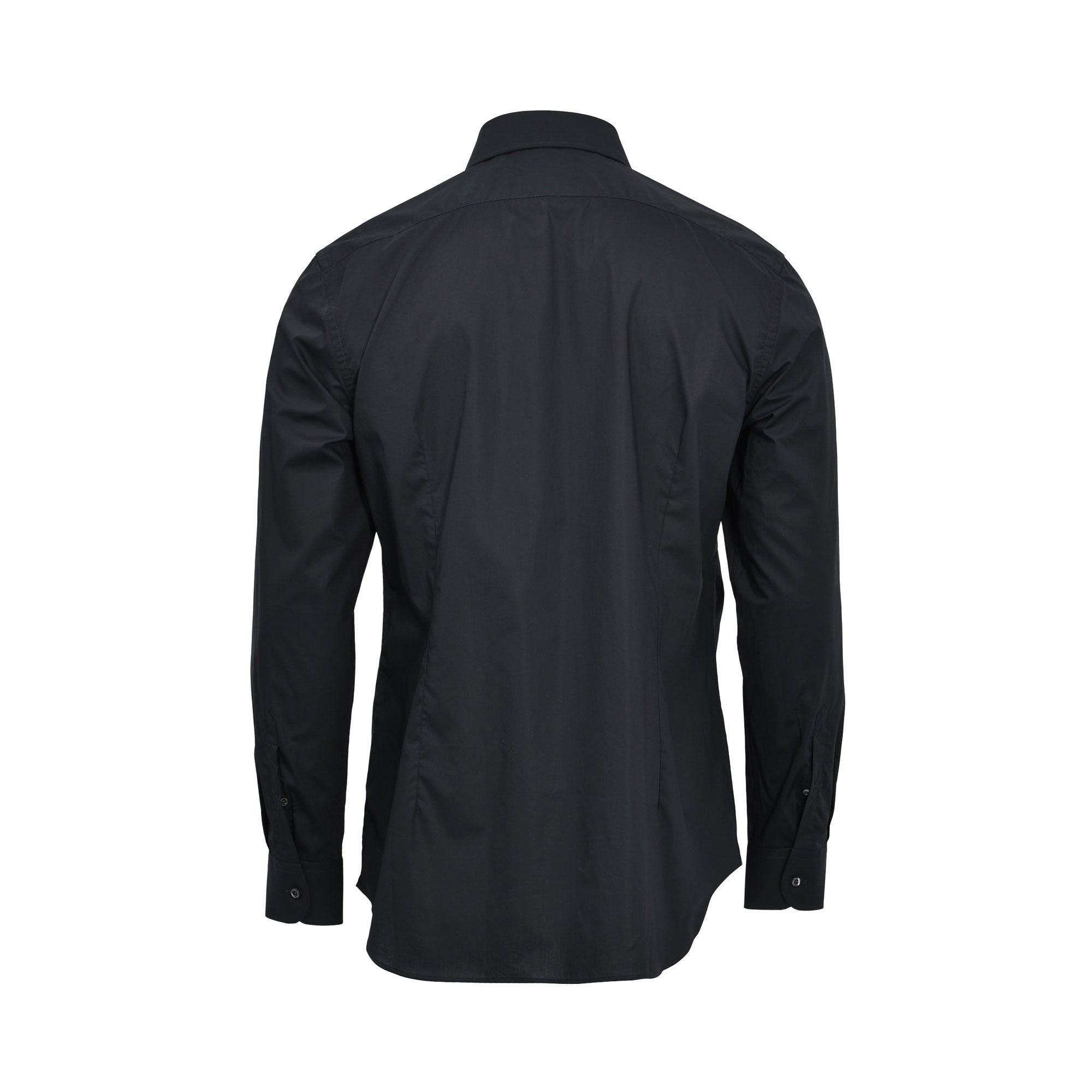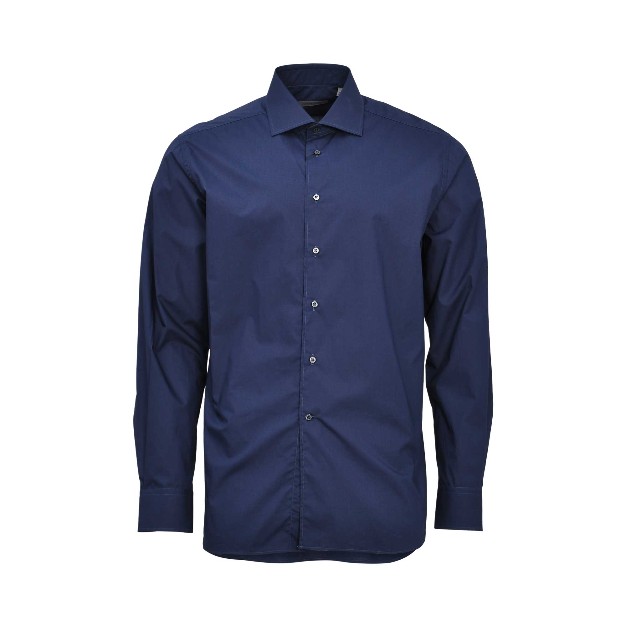 Color & Material: The shirt is a deep, solid Navy & Black color. It is crafted from a high-quality, fine-weave cotton fabric, likely a poplin or smooth broadcloth.
