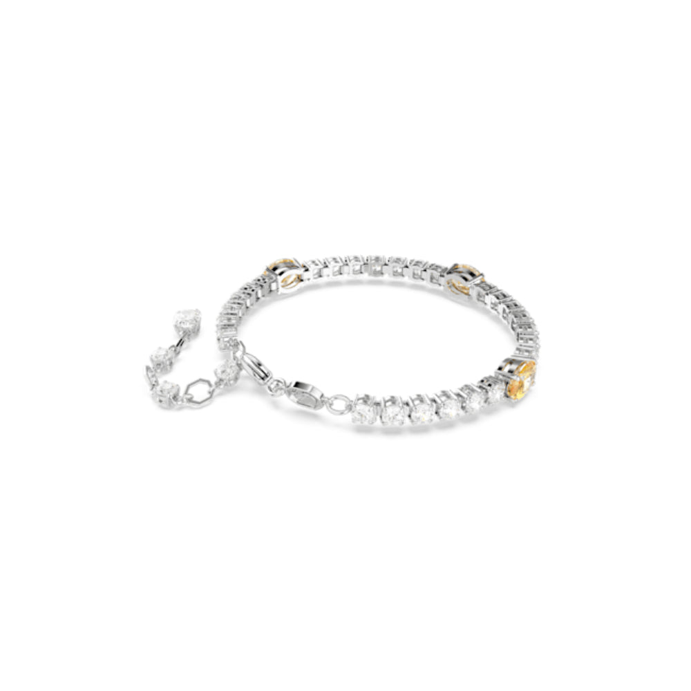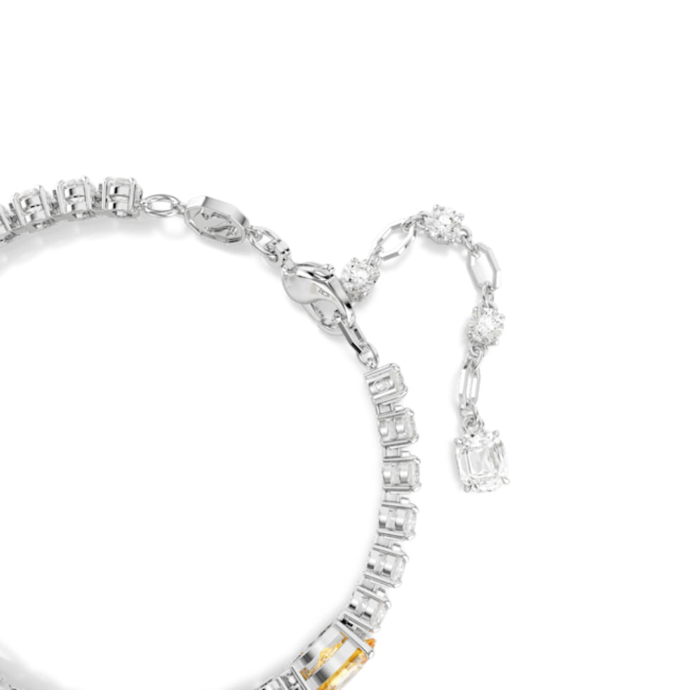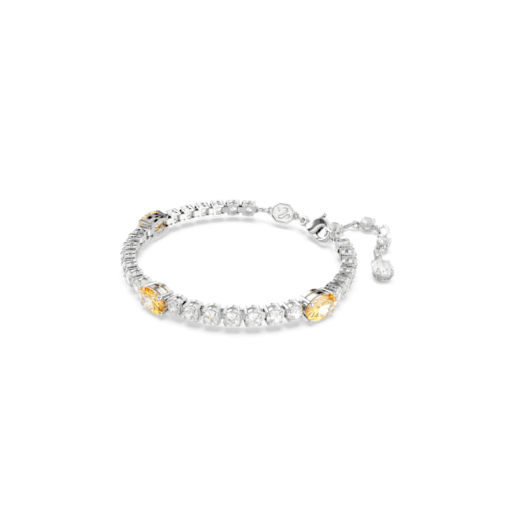 | Swarovski Matrix Tennis Bracelet Mixed cuts, Yellow, Rhodium-plated, Medium. This Matrix Tennis bracelet adds a dash of Swarovski elegance to a basic style with brilliant cuts and color. The rhodium-plated item has a lobster fastening and an all-around display of prong-set round clear crystals, as well as vivid and energizing yellow oval crystal accents. Wear it all day for a dazzling dose of delight. SPECIFICATIONS