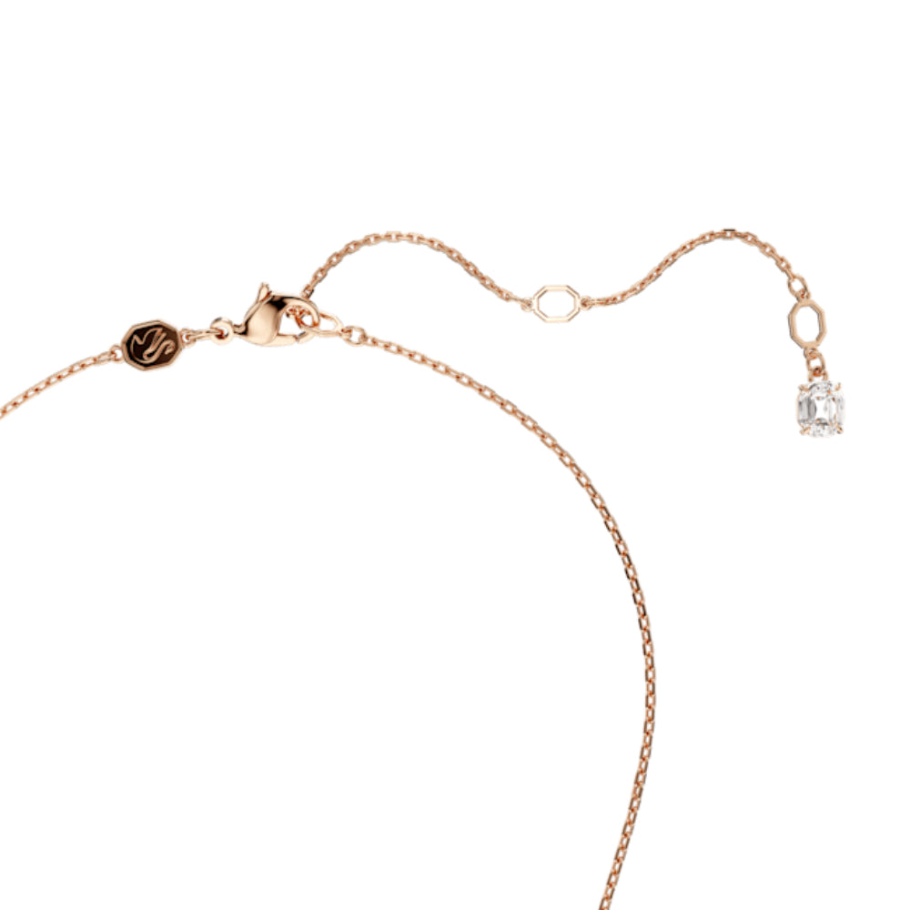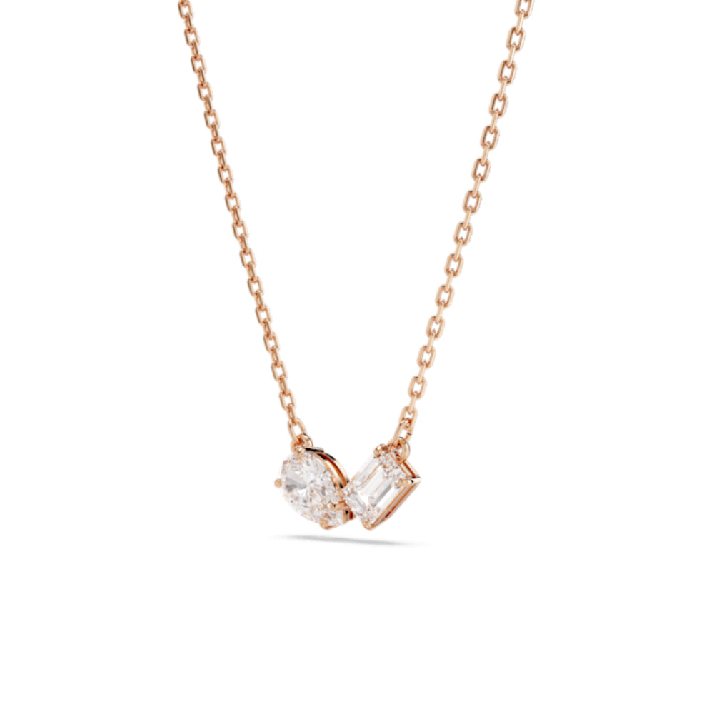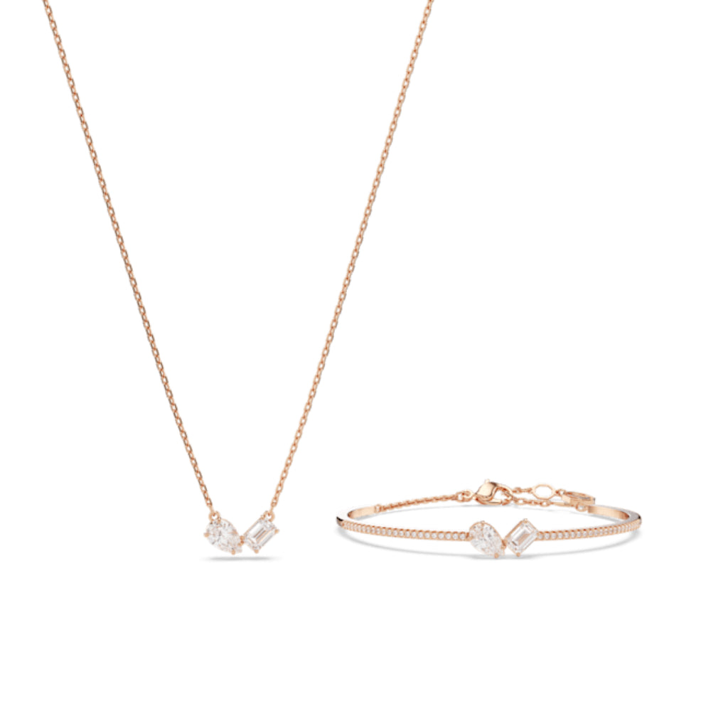 | Swarovski Mesmera Set (necklace and bracelet). Mesmera jewelry, with its mixed cuts and white and rose gold plating, is designed to turn heads, and this bright necklace and bracelet combination is no exception. Each rose gold-tone plated item has an octagon-cut and pear-cut Swarovski Zirconia at the center, which works perfectly together. The bracelet also features a stunning assortment of round-cut Swarovski Zirconia on either side. Complete with lobster closures, it's a set that can easily transition from day to night. SPECIFICATIONS
