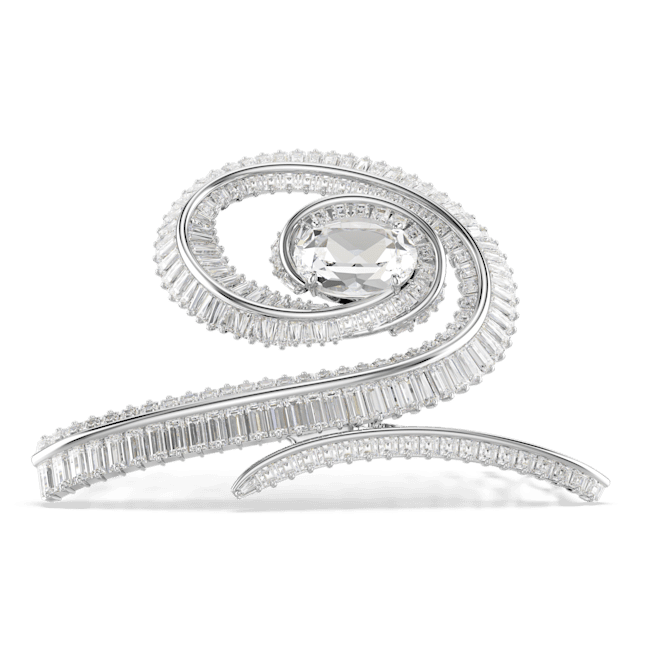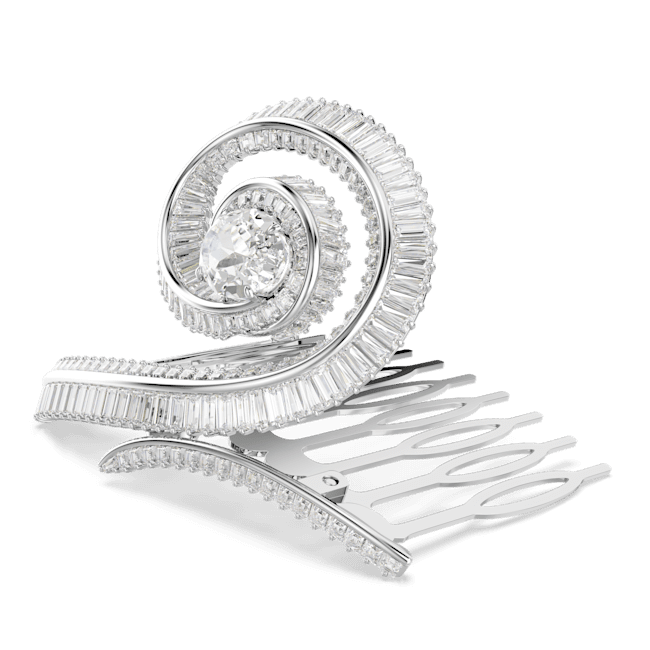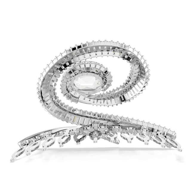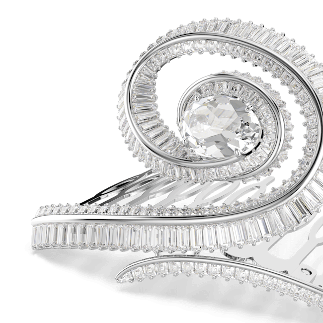 Swarovski Ariana Grande x Hair Clip Crystal pearl Baguette cut White Rhodium plated. This music-inspired hair clip allows you to exhibit your most creative side. The rhodium-plated design takes the abstract form of a treble clef and is gorgeously coiled. It is set with baguette-cut Swarovski Zirconia and a single Swarovski Crystal Pearl in the center. Play with your haircut and add a Swarovski rhythm twist to your accessories.