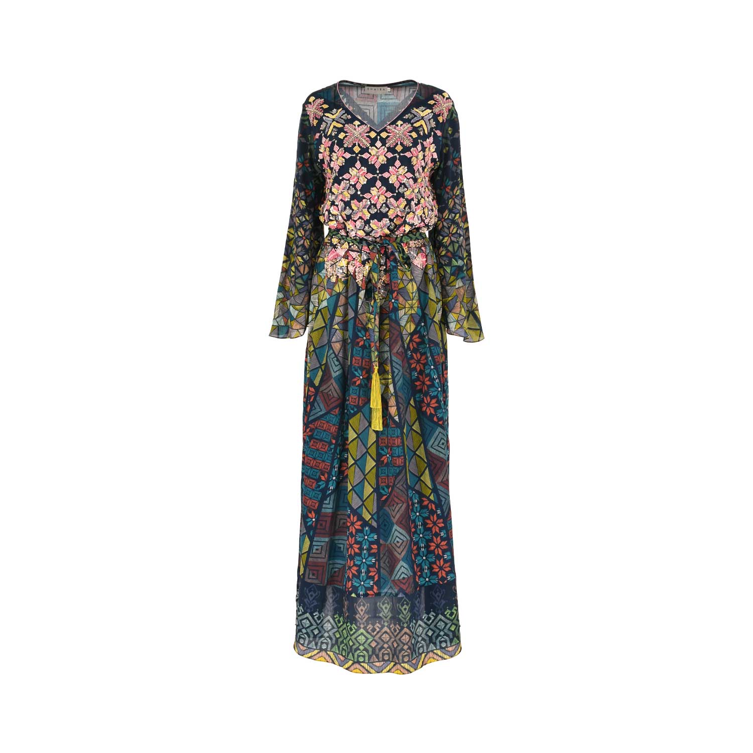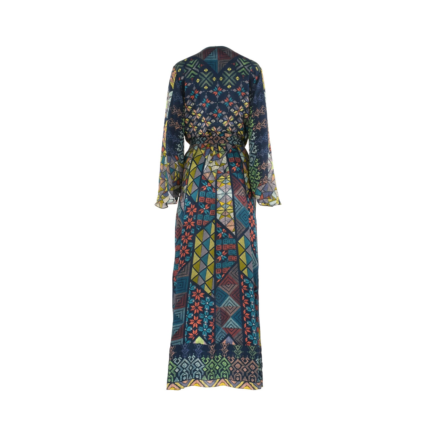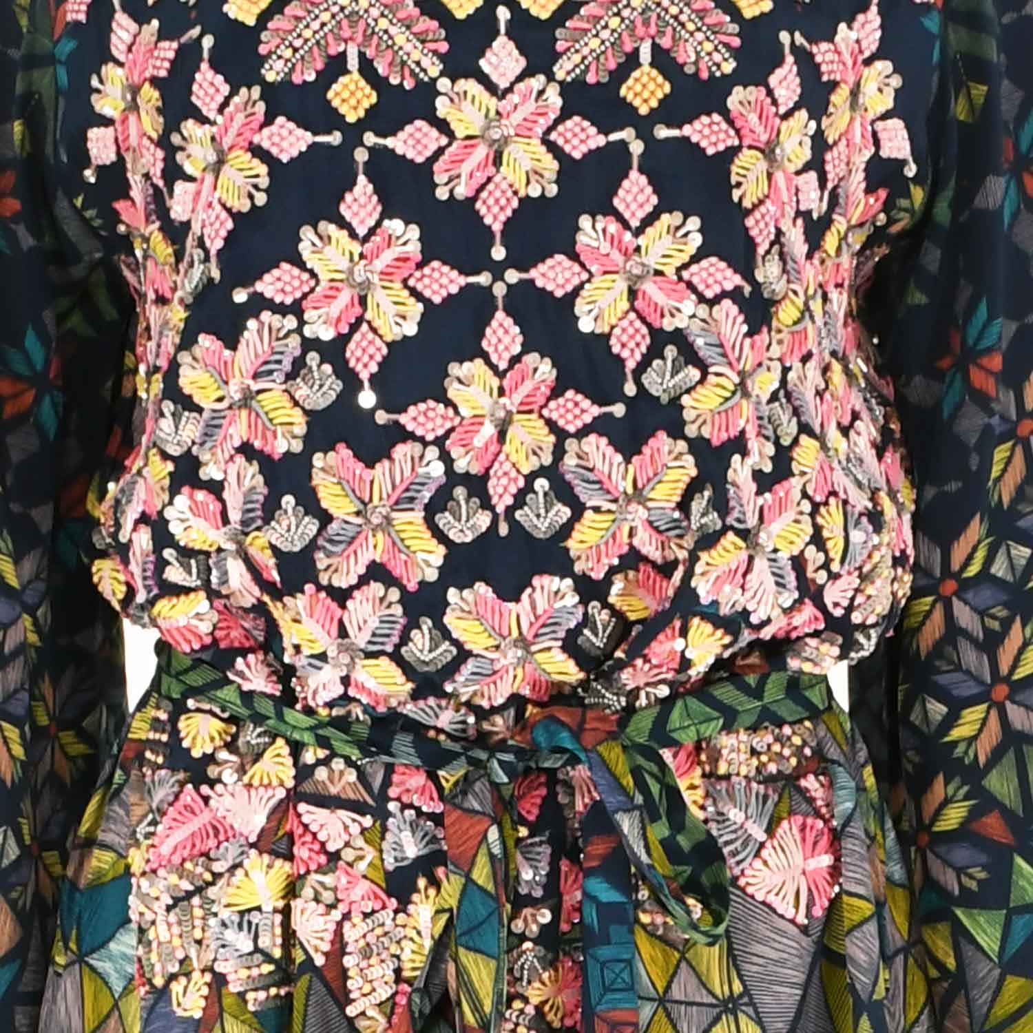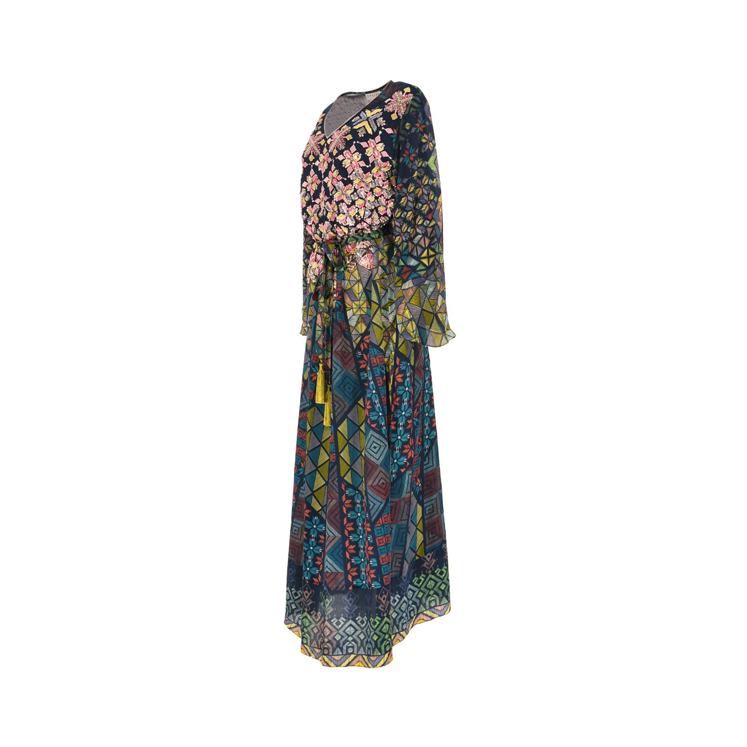 The Shaira Women's Blue Multicolour Jalabiya is a beautiful and unique piece of clothing. It features a v-neck, long bell sleeves, full length, and hand embroidery to the front. The matching belt with tassel and neckline trim with contrast pipeline add a touch of elegance to the look. The fabric is lightweight and comfortable, making it perfect for any occasion. The vibrant colors of the jalabiya will make you stand out in any crowd. The intricate hand embroidery adds a unique touch to the piece, making it a one-of-a-kind item. Whether you're attending a special event or just want to look your best, the Shaira Women's Blue Multicolour Jalabiya is the perfect choice. SPECIFICATIONS: