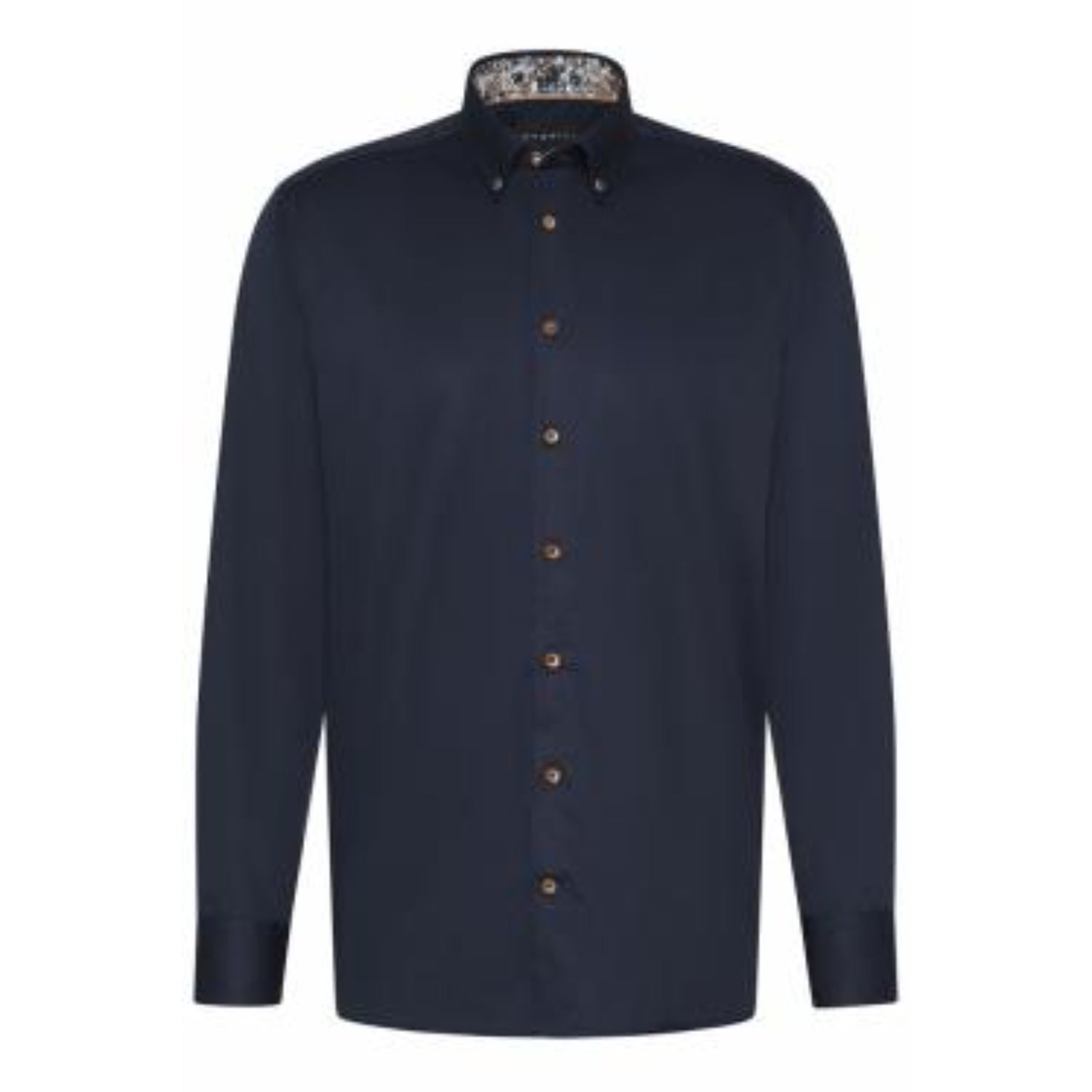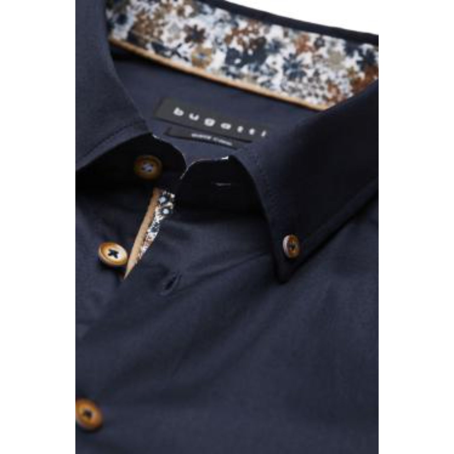 The Bugatti Men's Navy Blue Shirt is crafted from 100% high-quality cotton, ensuring a comfortable and breathable wear throughout the day. Designed with a slim-fitting modern cut, this shirt offers a sleek and tailored silhouette that complements a contemporary wardrobe. It features a button-down collar, adding a touch of classic style while maintaining versatility for both casual and semi-formal occasions. The shirt is detailed with square-shaped 2-button cuffs, providing an elegant and distinctive finish to the sleeves. Perfect for men who appreciate refined design and premium fabric, this navy blue shirt combines comfort and sophistication seamlessly.