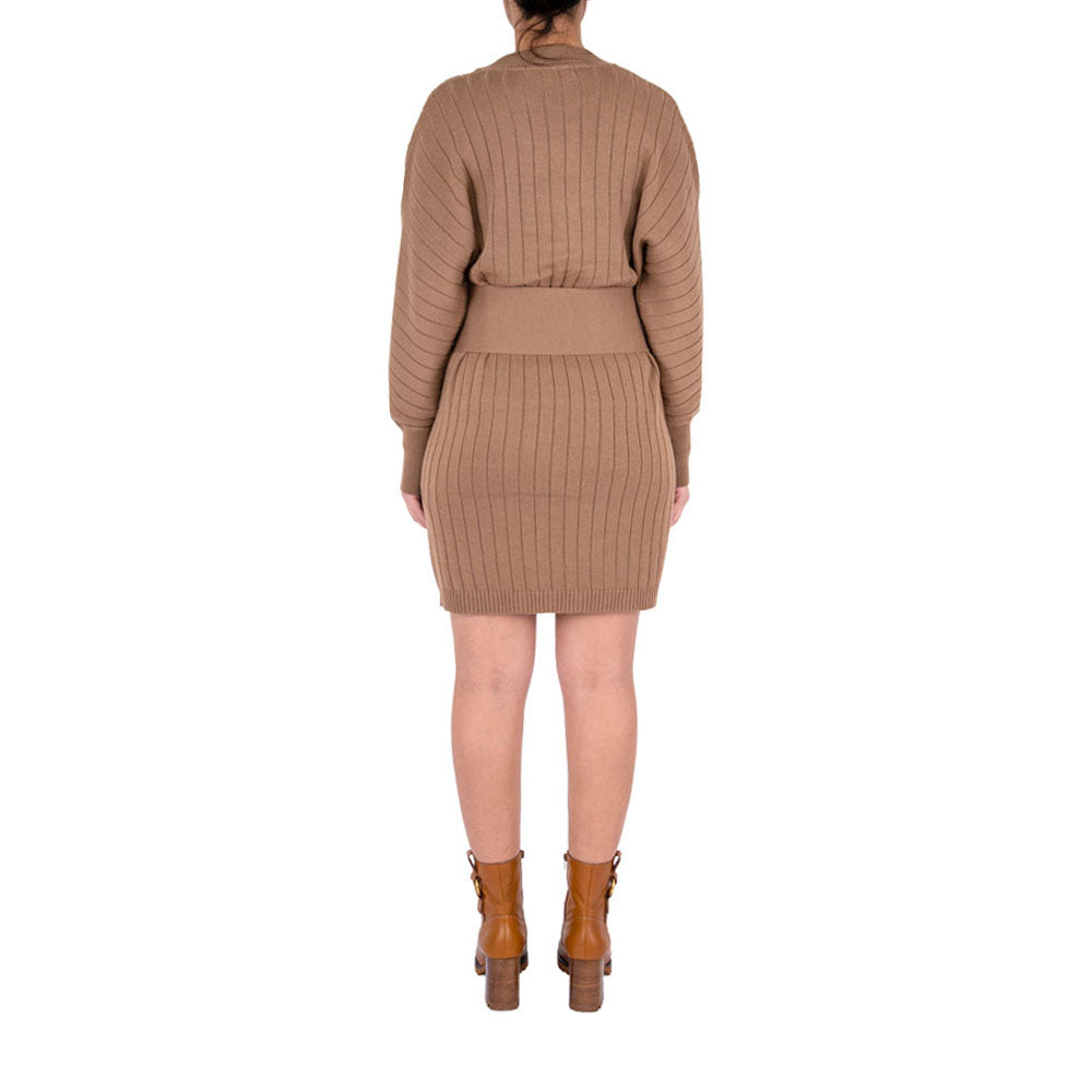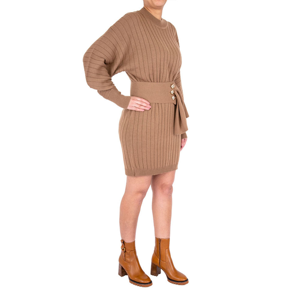 Brown square sleeves knit dress with belt.Perfect throw-on piece for casual winter days.