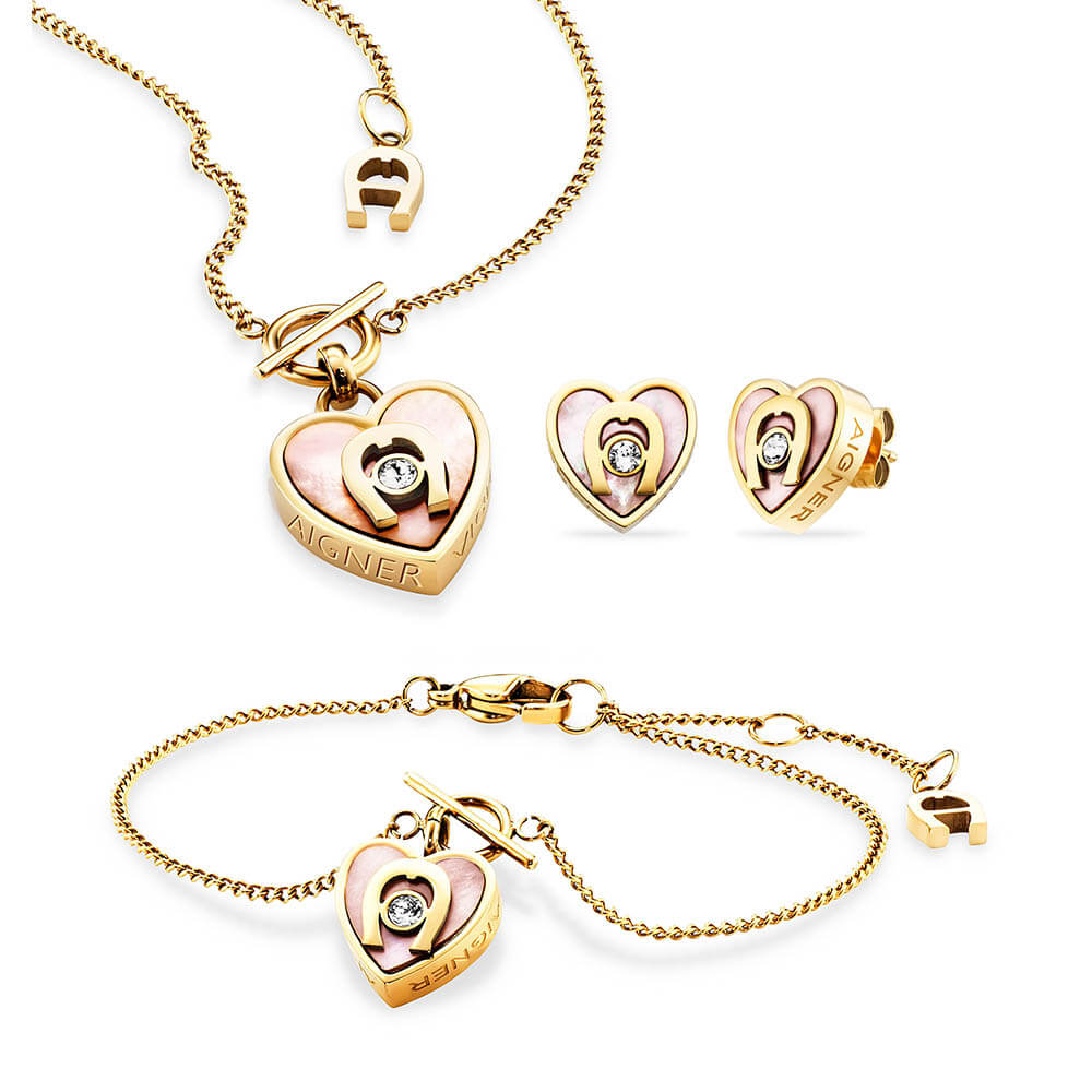 Express your romantic side with this elegant Aigner jewelry set. This set includes a necklace, earrings, and a bracelet, all featuring a delicate heart motif with a touch of sparkle. The hearts are adorned with a soft pink enamel and the iconic Aigner "A" logo, along with a sparkling crystal accent in the center. The warm gold-tone finish adds a touch of luxury to this charming set.