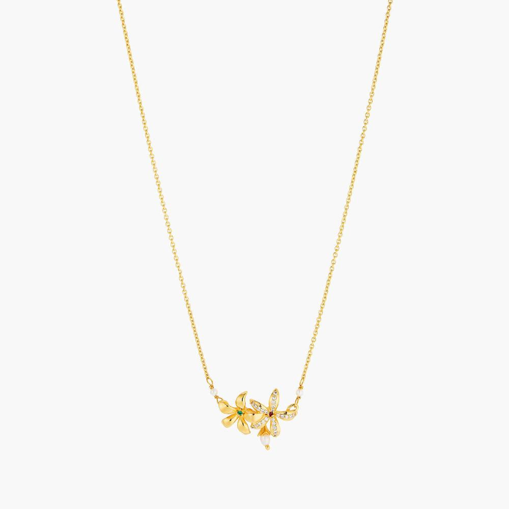 Explore the Star Jasmine collection and its jewellery to keep with you at all times. The French House Les Néréides offers you this delicate thin necklace and its star-shaped flowers, one is encrusted with small clear crystals and a red crystal, the second features a small green crystal. The opacity of its small white pearls gives this necklace a breath of fresh air for outstanding women.
