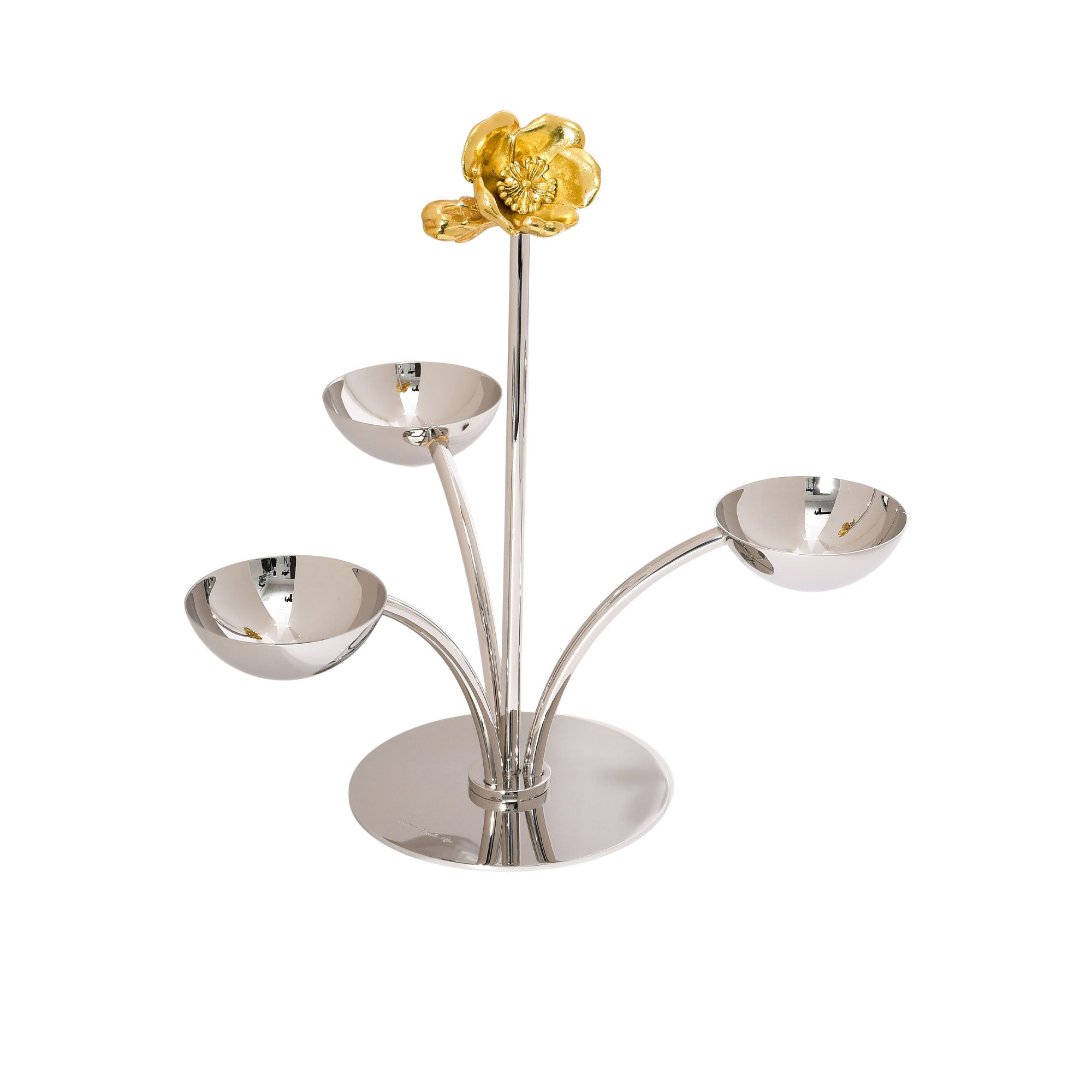 This elegant dip dish features a unique floral design with three interconnected bowls. A delicate gold flower sits atop the central stem, adding a touch of luxury. The bowls are held in place by curved, metallic branches that rise from a circular base. The dish's polished silver finish complements the gold flower beautifully. It's perfect for serving a variety of dips, sauces, or small snacks at parties or gatherings. The dish's creative design makes it a conversation starter and a stylish addition to any table setting.