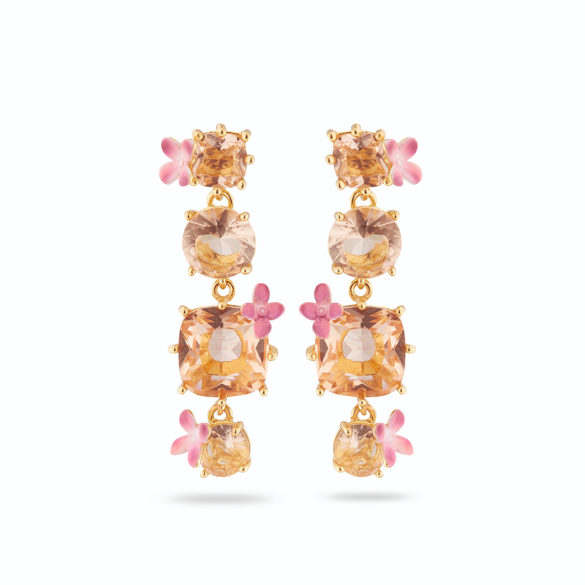 Les Nereides Apricot Peach Diamantine 4 Stone and Flower Dangling Post Earrings