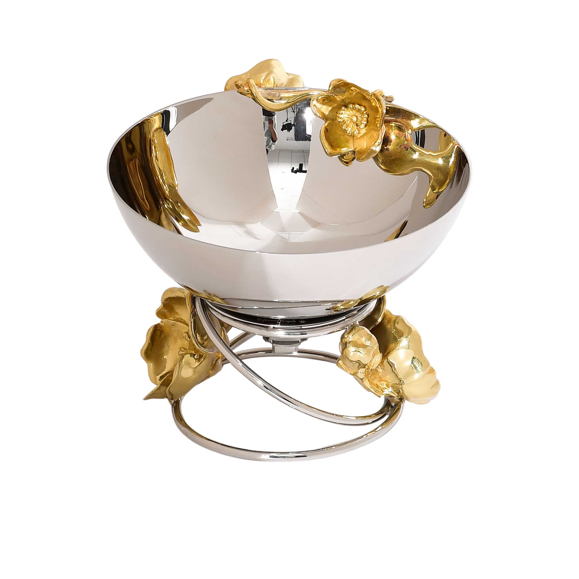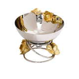 This elegant serving bowl features a round shape with a polished silver finish. The bowl is adorned with delicate, gold-colored flower accents that create a beautiful and intricate design. The bowl rests on a curved, metallic stand that adds a touch of sophistication. The dish's luxurious appearance makes it perfect for serving snacks, desserts, or as a decorative centerpiece.