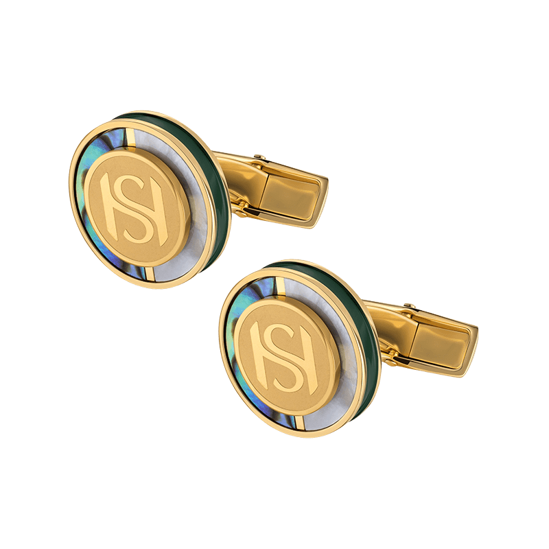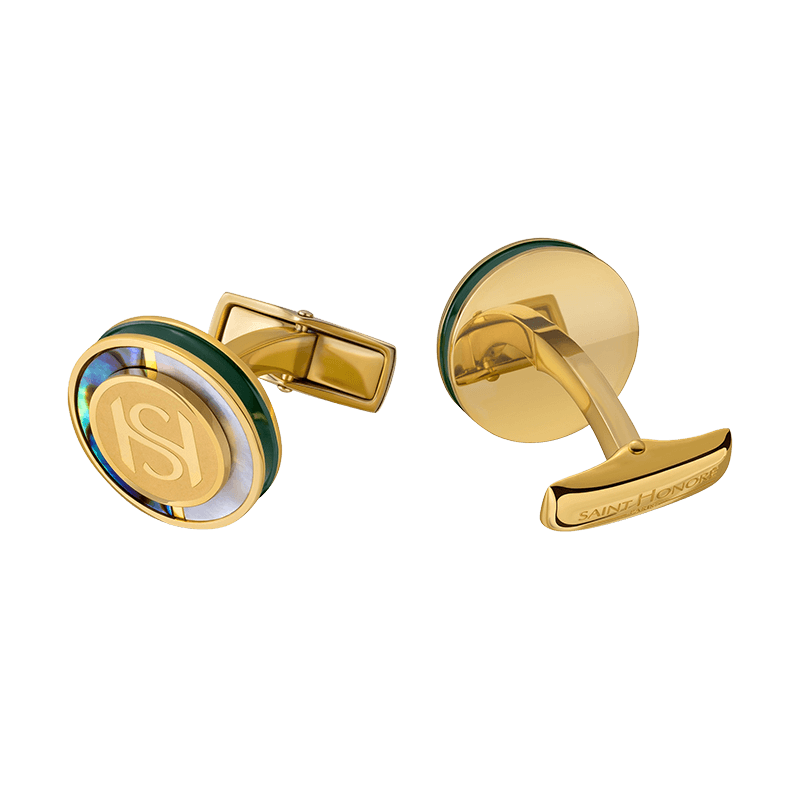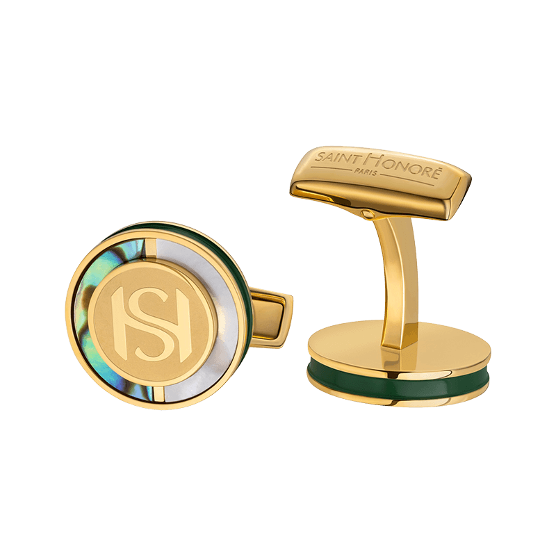 Elevate your formalwear with these sophisticated Saint Honore cufflinks. Featuring a rich dark green outer ring surrounding a polished gold-plated disc with a luminous Mother-of-Pearl inlay, these cufflinks exude classic elegance.