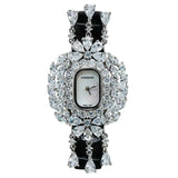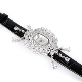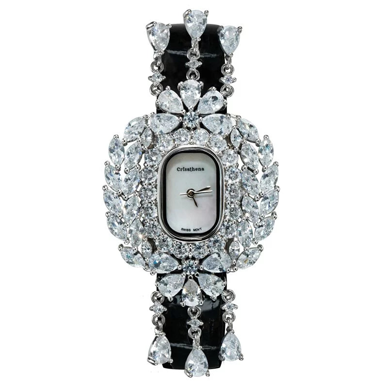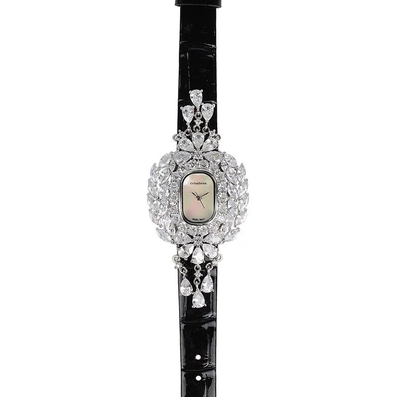 Crisathena Paris Chandelier Ladies MOP Dial White Gold Case Black Leather Strap Watch