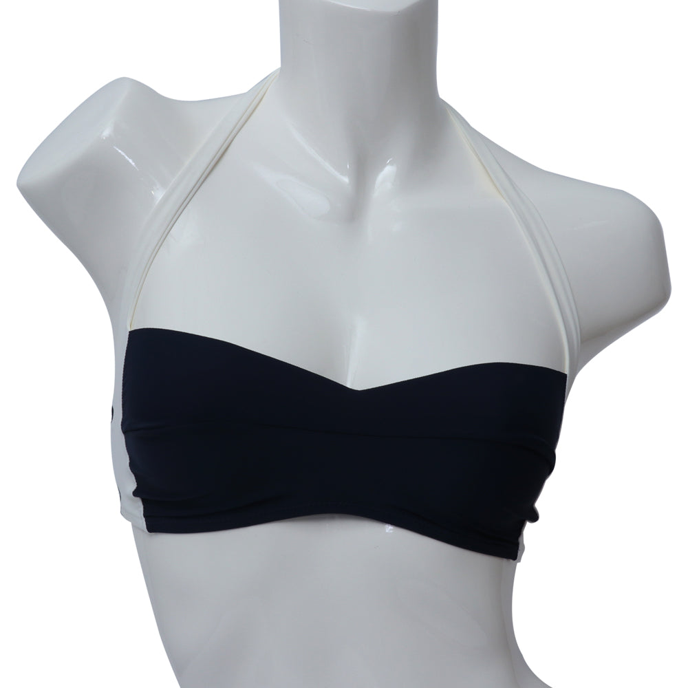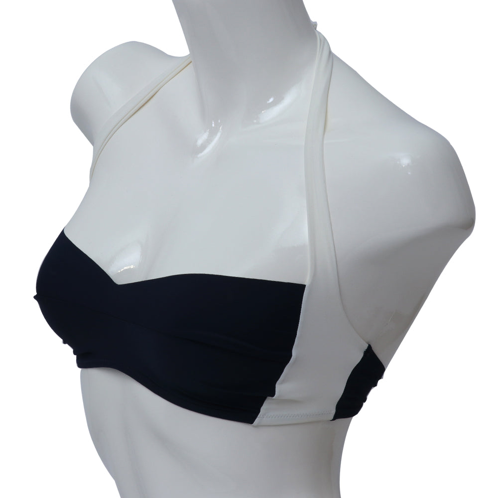 صدرية بيكيني غير مبطنة لسباحة مصنوعة من ألياف دقيقة مرنة . بها أحزمة بيضاء تربط خلف العنق يمكن تعديلها ارتدائها بسهولة