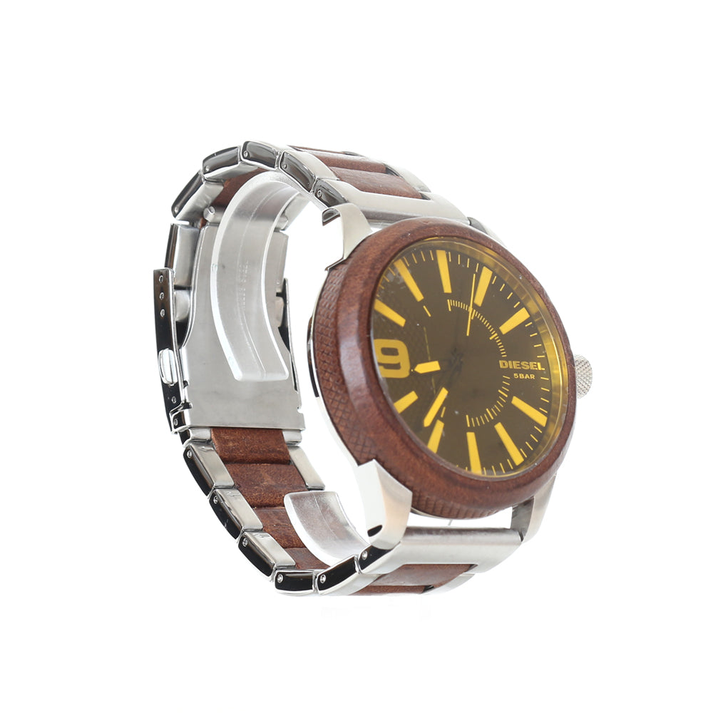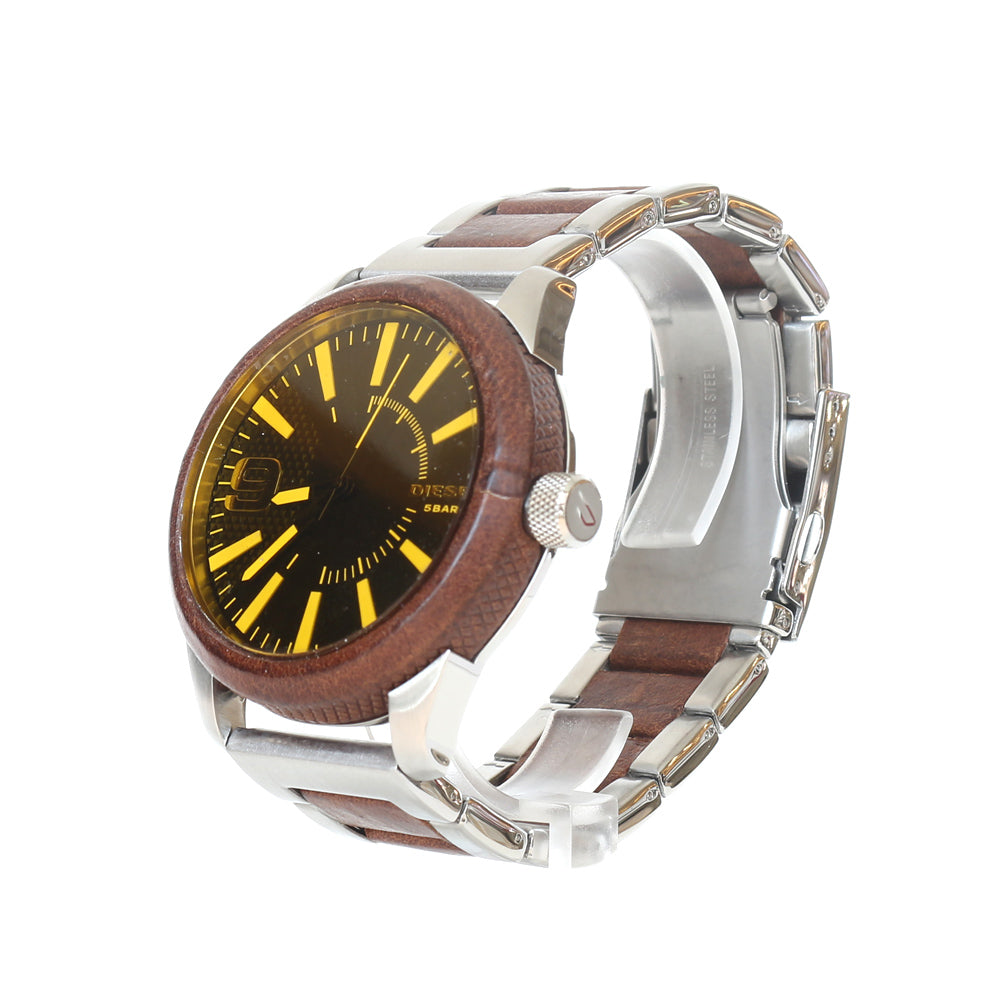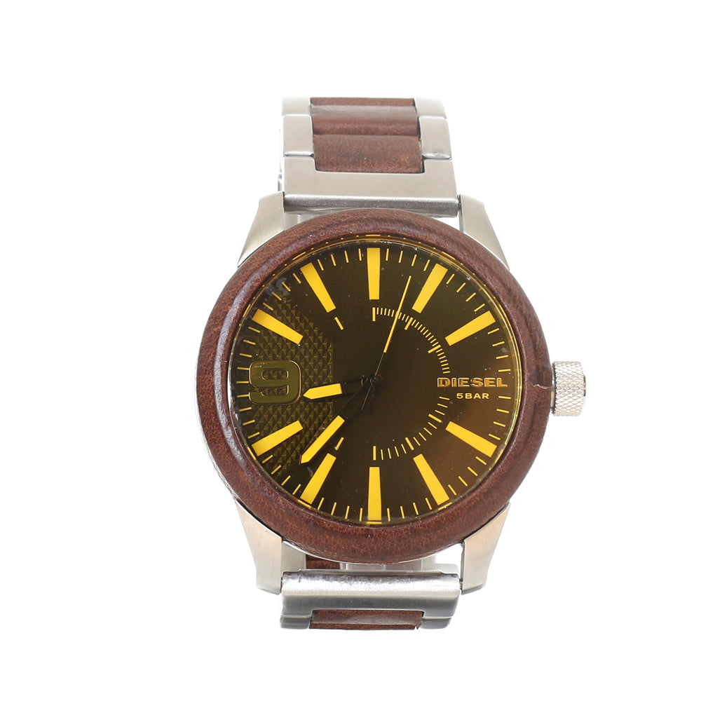 ساعة ديزل رجالي من الستيل ميناء أصفر على سوار من الجلد الاسود