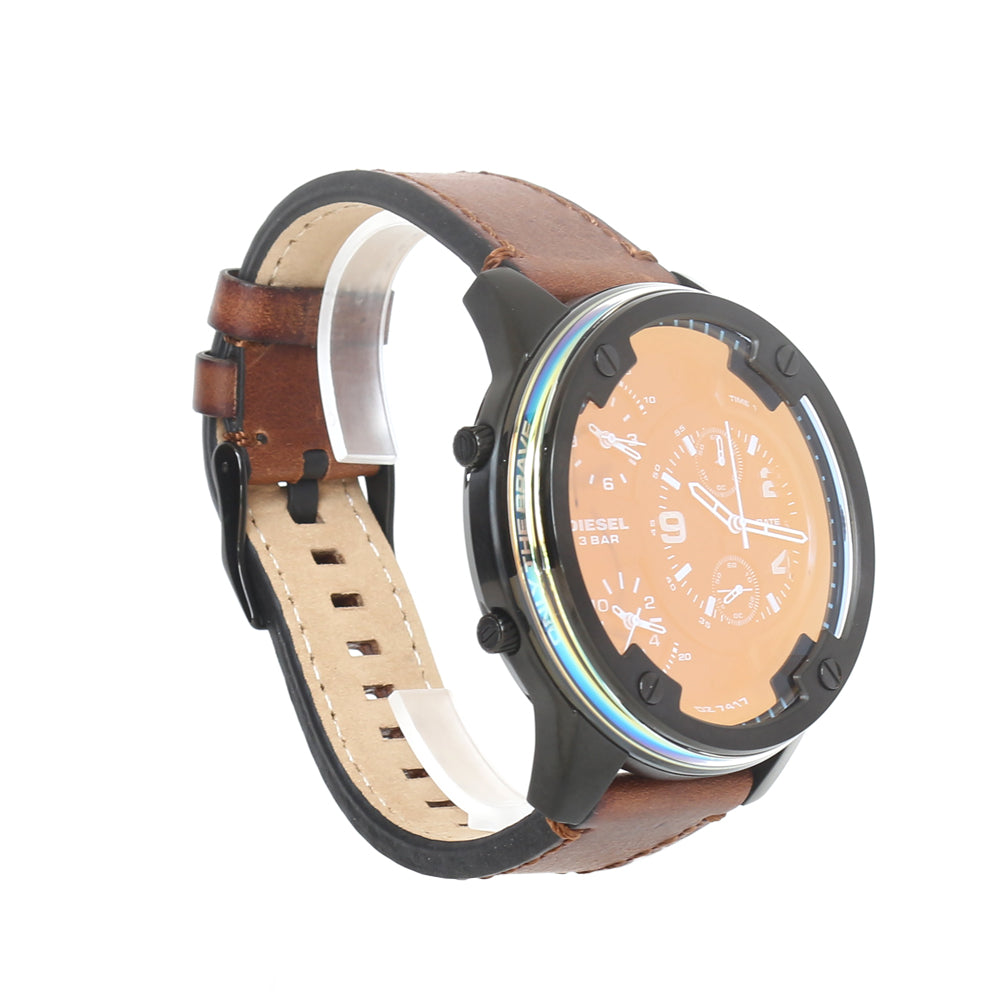 ساعة ديزل رجالية من الستيل مع 3 واقيت زمنية وميناء أسود وسوار من الجلد البني