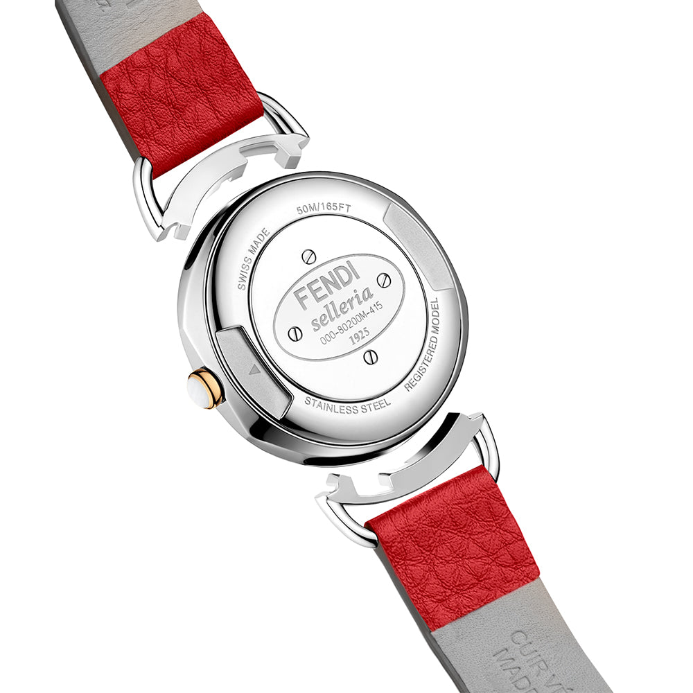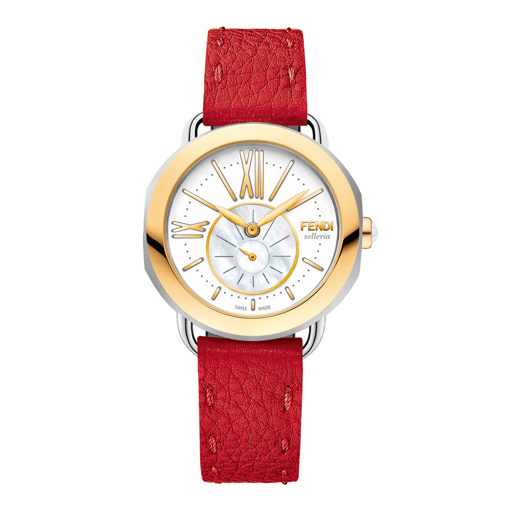 ساعة فيندي نسائية تشكيلة سيليريا بقطر 36 مم ذات هيكل دائري فضي من الستانلس ستيل مع اطار و تاج من الذهب الاصفر عيار 18 مع مينا بيضاء يتوسطها مينا داخلية صدفية صغيرة للثواني مع عقارب و مؤشرات ذهبية و حزام جلدي ذهبي مزركش بشعار العلامة