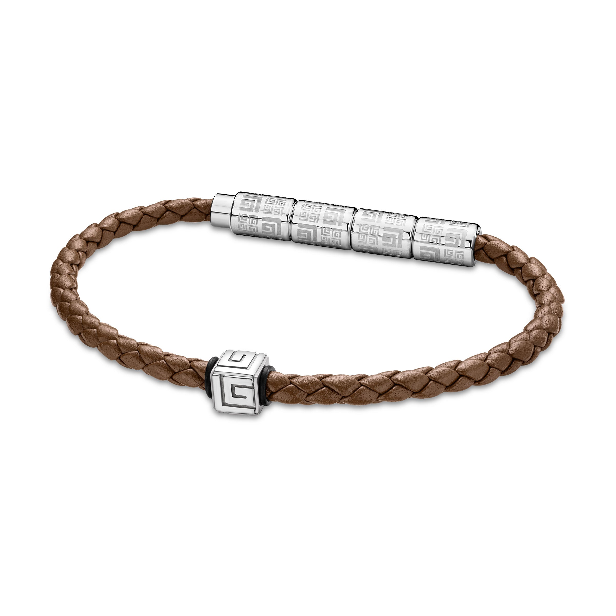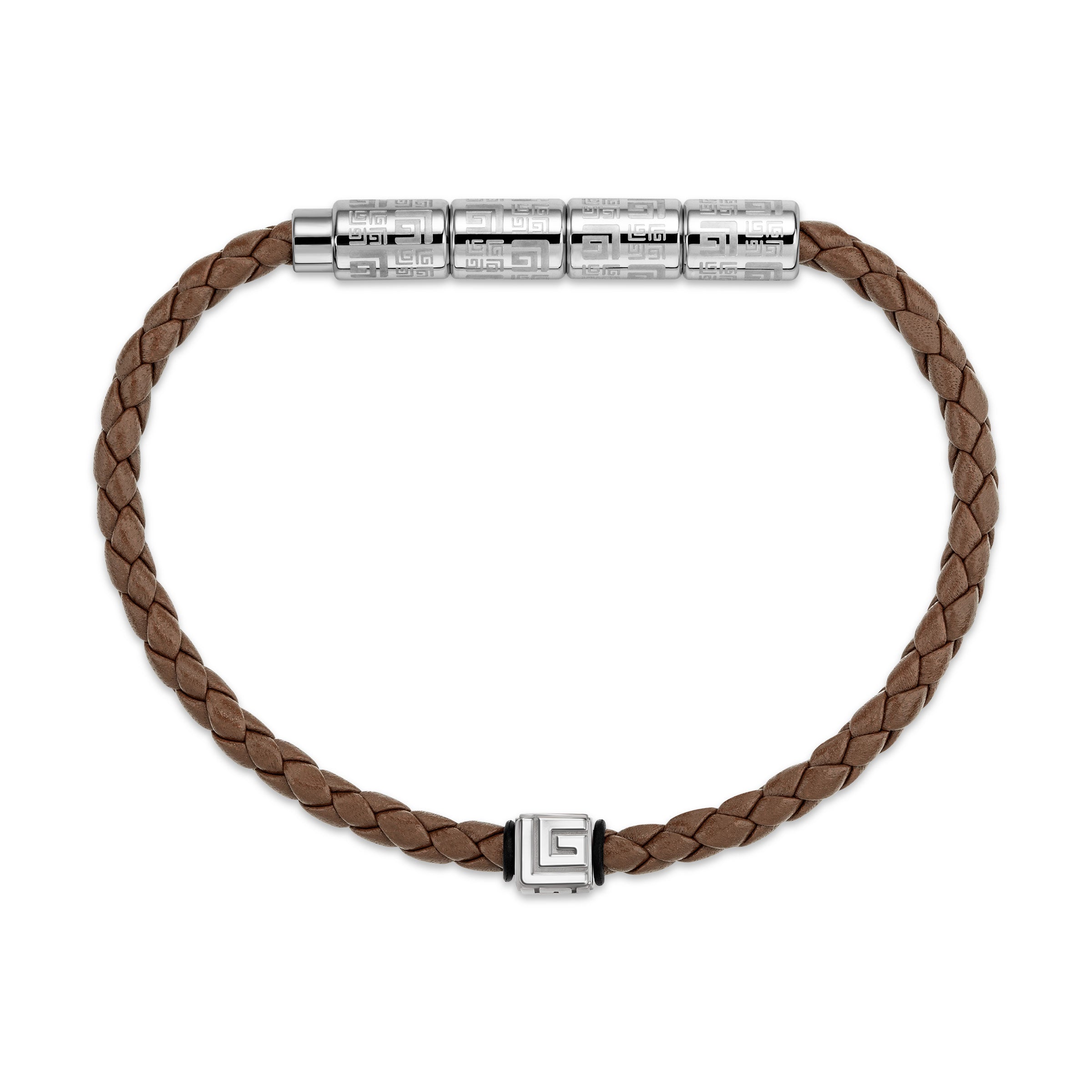 | Experience urban elegance with Gabriel's brown braided leather bracelet. Featuring industrial elements etched with the iconic GL logo, the bracelet boasts an elegant and timeless design, enhanced by its magnetic clasp for effortless wearability. |