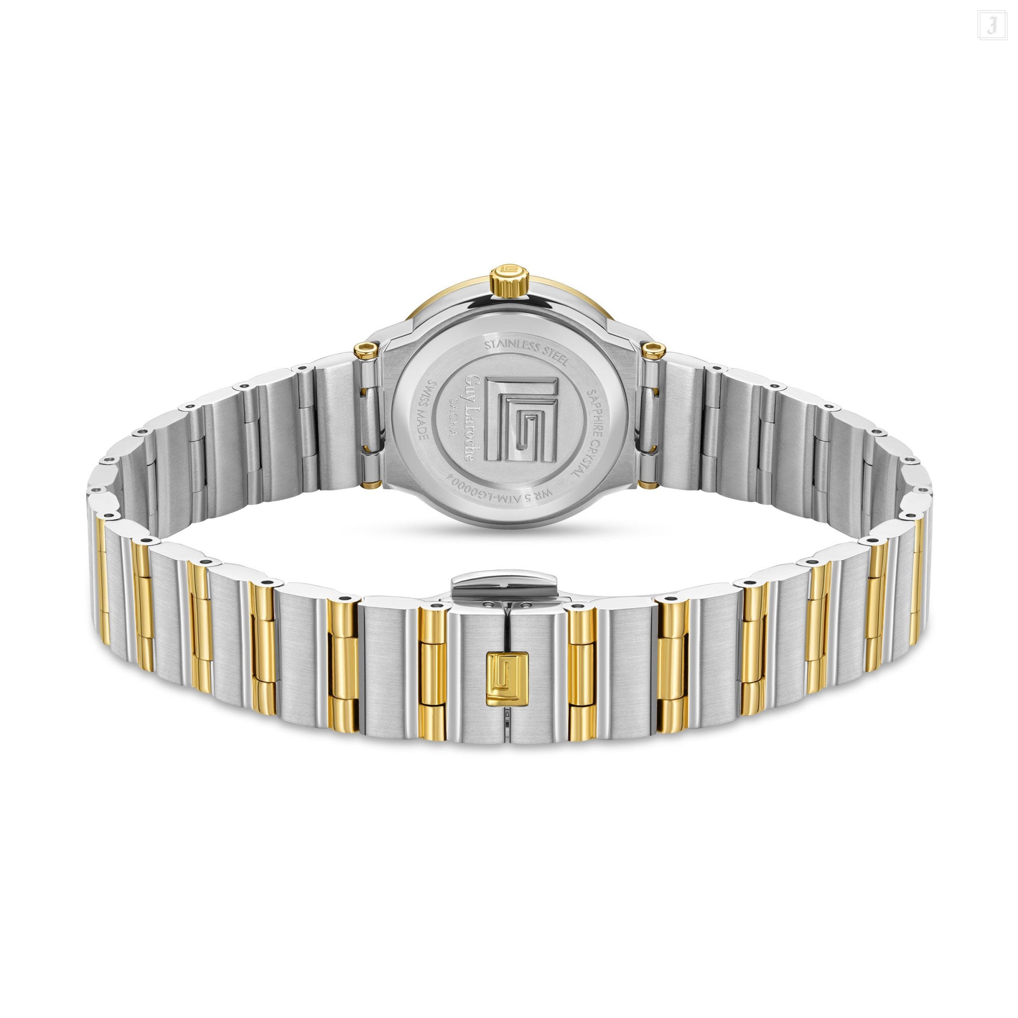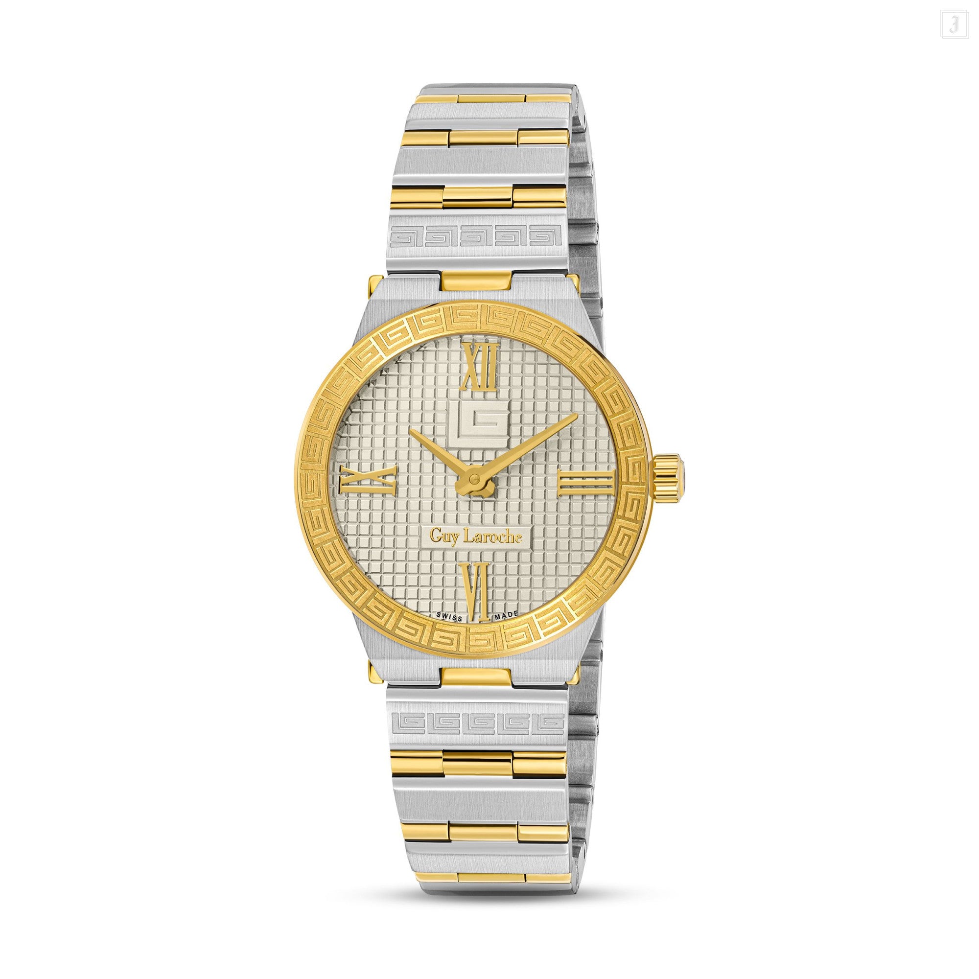 | Exuding an ultra-feminine vibe, Guy Laroche's Sacha is characterized by the iconic 'GL' lettering on the gold-plated topring offset by the gullicohe pattern on the white dial. The refined and sohisticated design is complete with the 'GL' motif on the links of the dual-toned bracelet. |