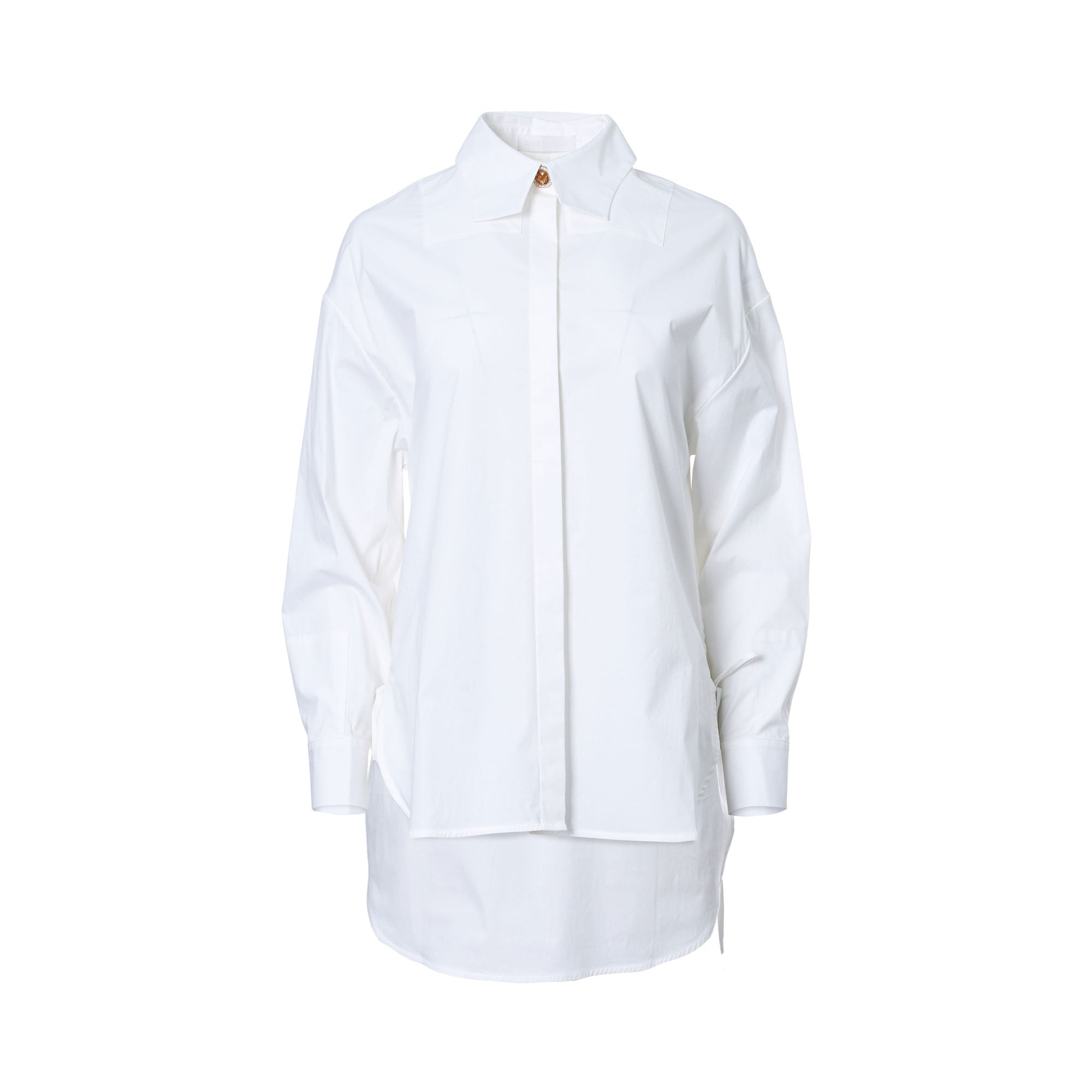 Anne Fontaine is a renowned fashion designer known for her elegant and sophisticated designs. Her signature line of women's blouses is highly coveted by fashion connoisseurs. One such standout piece is the women's white blouse, designed with an assymetrical hemline for a modern twist. Made from high-quality poplin material, it exudes luxurious comfort and style. The blouse features a concealed button closure for a clean and polished look, and full sleeves for a more classic silhouette. Perfect for both formal and casual occasions, this Anne Fontaine blouse is a must-have for any fashion-forward woman's wardrobe. Its versatility and timeless design make it a staple piece that can elevate any outfit. Known for her attention to detail and impeccable craftsmanship, Anne Fontaine's white blouse is a symbol of understated elegance and effortless chic. It is a definite must-have for any fashion lover. SPECIFICATIONS
