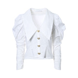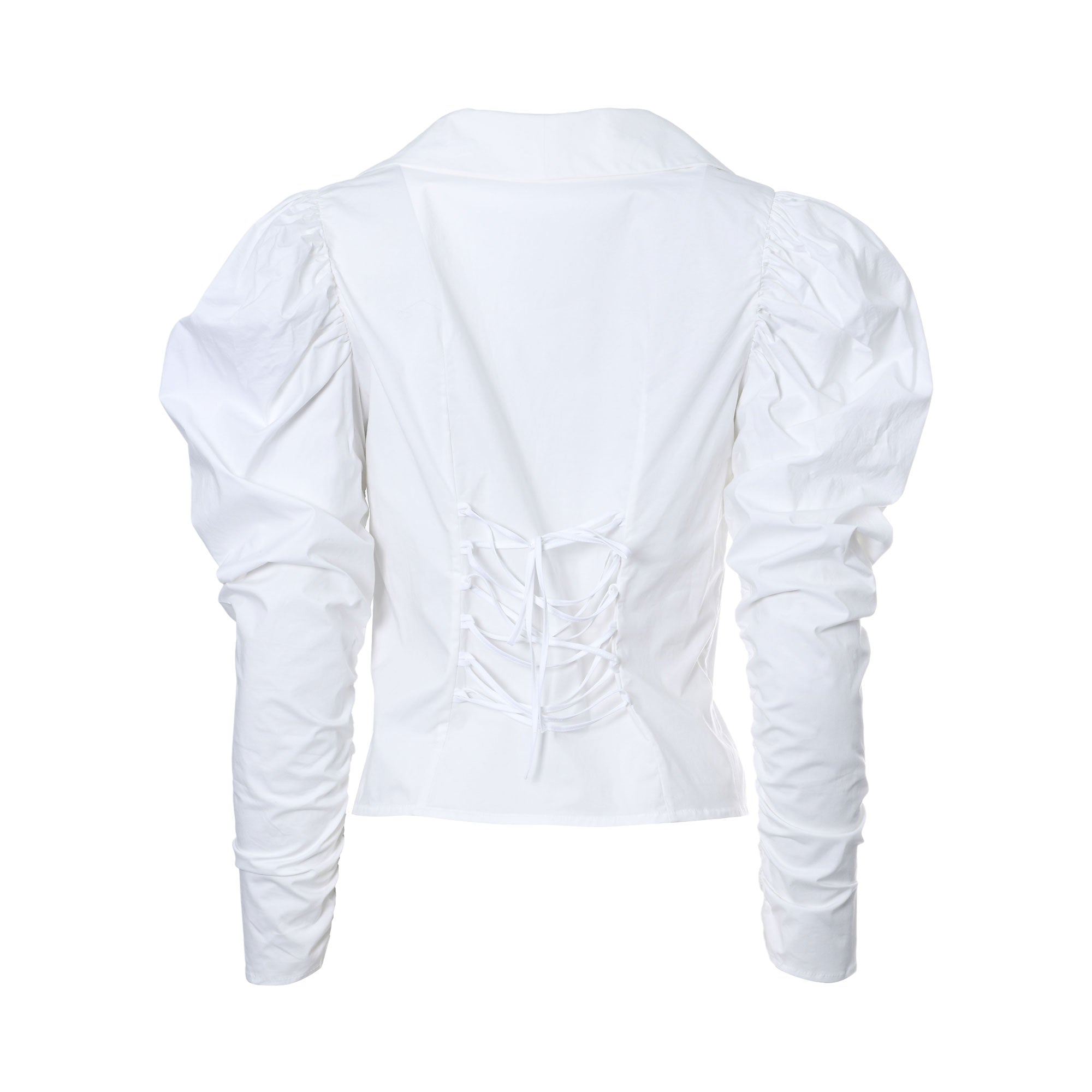 The Anne Fontaine Women's Philadelphia White Top exudes elegance and femininity. Made from crisp white poplin, this shirt features puff sleeves that add a touch of drama and an oversized v neck collar that is both sophisticated and alluring. The mini gold heart button-down at the center of the front adds a touch of charm and playfulness to the overall design. With its romantic and dreamy aesthetic, the Philadelphia top is a nod to French style and culture. The statement silhouette is sure to turn heads and make a lasting impression. Effortlessly chic and versatile, this top can be dressed up for a special occasion or dressed down for a casual day out. The easy fit of the top allows for comfort and movement, while the contrasting metallic buttons add a contemporary edge to the overall whimsical look. Pair it with your favorite jeans for a casual yet stylish outfit, or tuck it into a midi skirt for a more polished and put-together look. The Anne Fontaine Women's Philadelphia White Top is a must-have for any fashion-forward woman looking to add a touch of French sophistication to her wardrobe. It embodies the perfect balance of femininity, romance, and modernity, making it an essential piece for any fashionista. Embrace your inner Parisian with this stunning and timeless top. SPECIFICATIONS