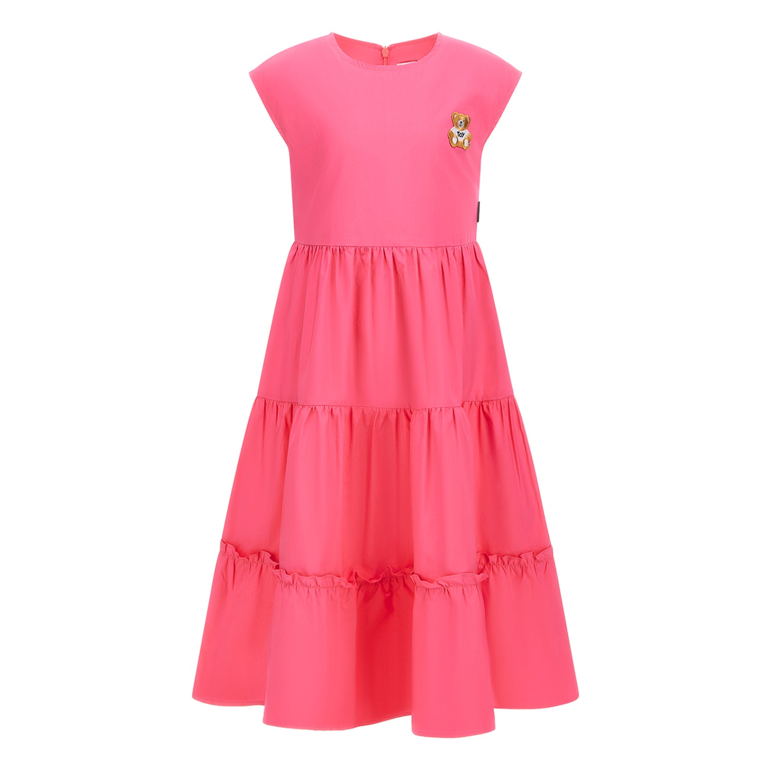 The Moschino Kids Girl's Pink Dress is a charming and stylish choice for young fashion enthusiasts. Crafted in a vibrant pink hue, this dress features a classic crew neck that offers a comfortable fit, while its sleeveless design allows for ease of movement and a summery feel. The tiered skirt adds a playful and elegant touch, creating a lovely silhouette that is perfect for special occasions or everyday wear. The dress is designed with a concealed rear zip fastening, ensuring a seamless look and making it easy to put on and take off. Combining comfort with chic details, this Moschino dress is ideal for any little girl who wants to stand out with a fun, yet sophisticated outfit.