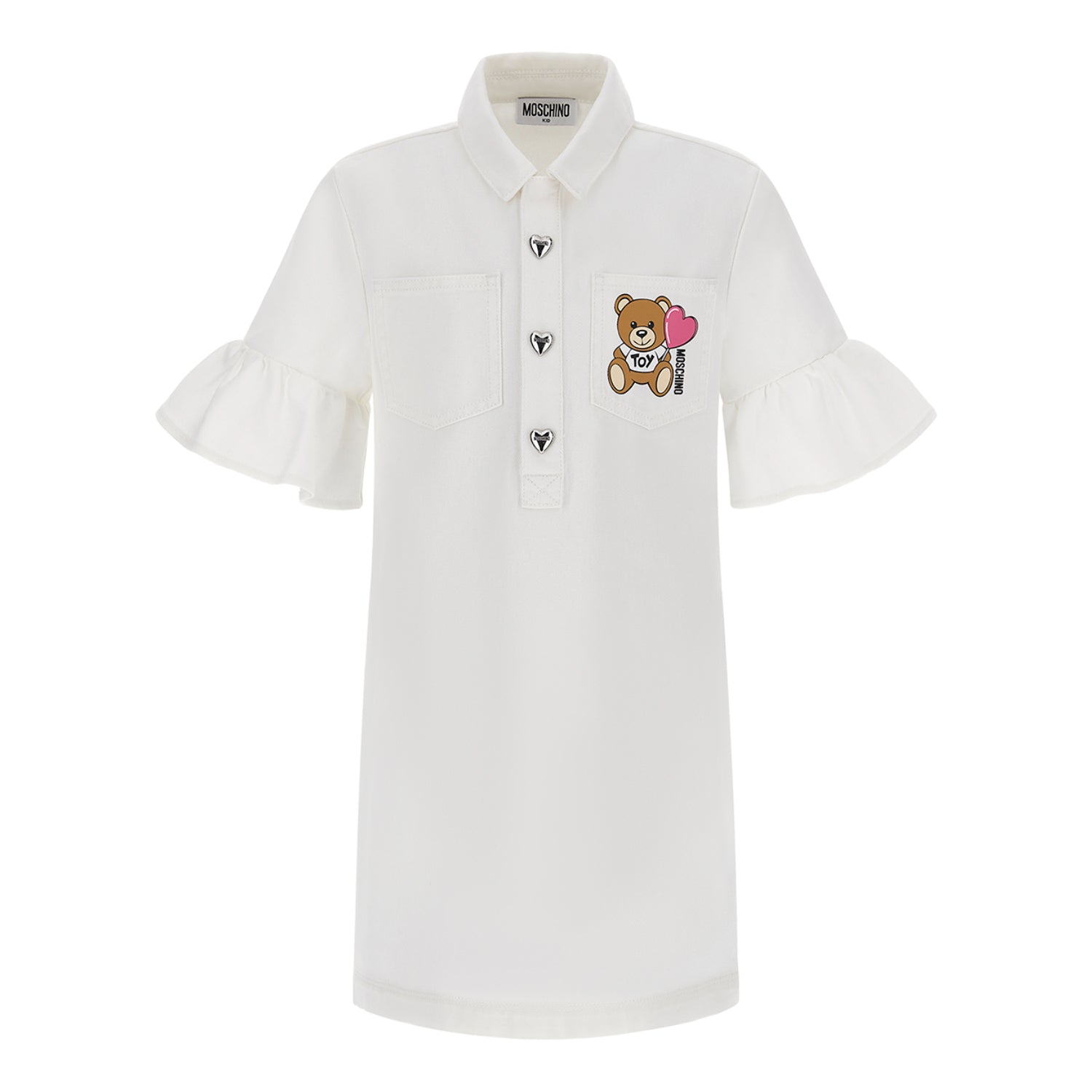 The Moschino Kids Girl's Cloud Dress is a charming denim dress that perfectly blends playful style with comfortable design. Featuring the iconic Teddy Bear logo, it offers a distinctive and recognizable look that young fashion enthusiasts will love. The dress is crafted in a relaxed A-line shape, ensuring ease of movement and comfort for active kids. Adding to its stylish appeal are short bell sleeves, chest patch pockets, and a neat collar that give the dress a trendy yet classic vibe. It fastens at the front with silver, heart-shaped poppers, each embossed with the Moschino name, providing an extra branded detail that enhances its overall fashionable finish. This dress is an ideal choice for girls who want to stand out with a fun, designer look without compromising on comfort.