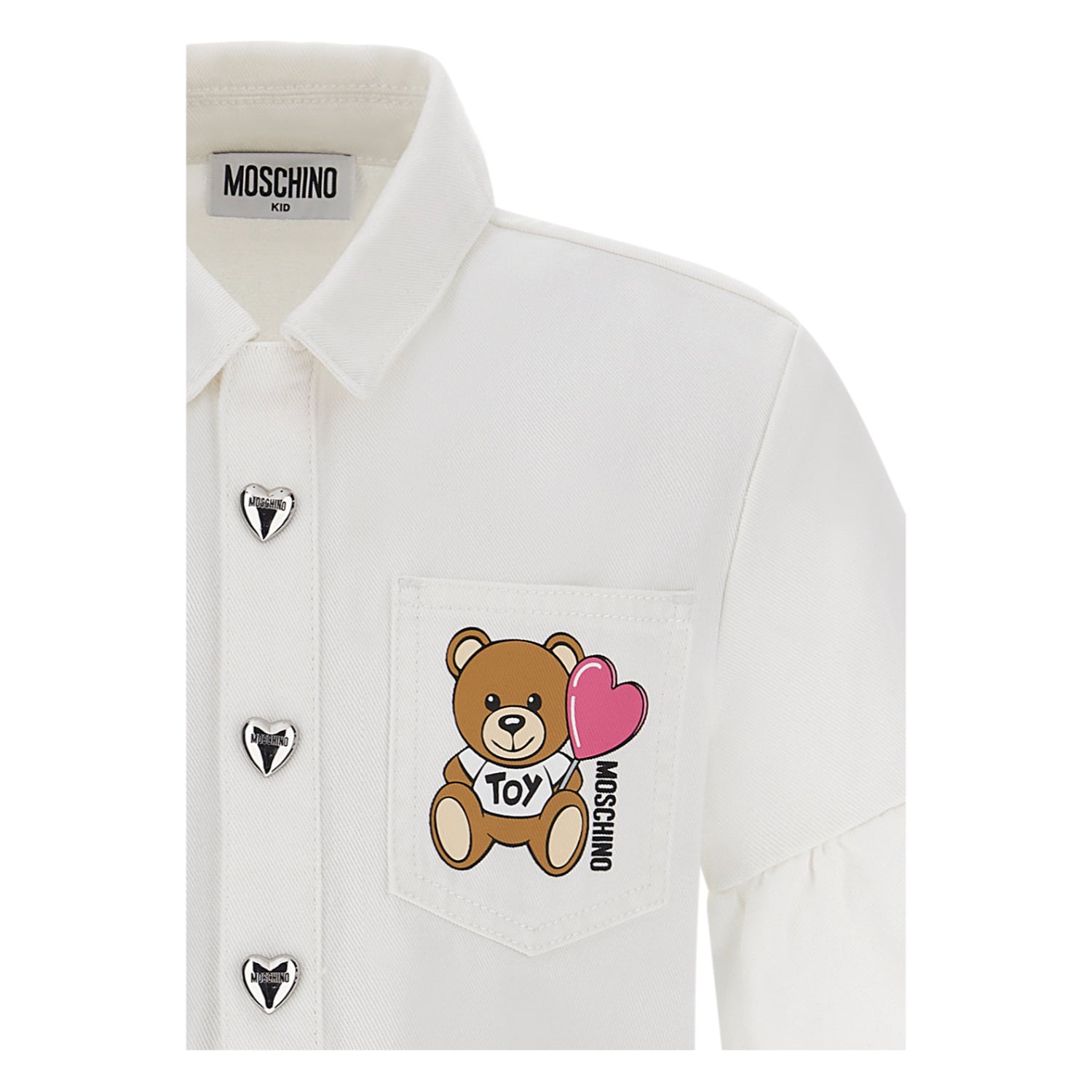 • Front fastening with silver, heart-shaped poppers embossed with Moschino name