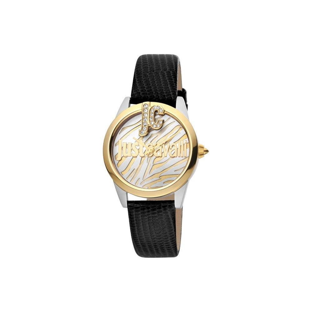 ساعة جست كافالي نسائية ذات هيكل فضي و ذهبي من الستانليس ستيل مع مينا ذهبية بزركشة جلد حيواني وحزام جلدي أسود طقم مع اسوار