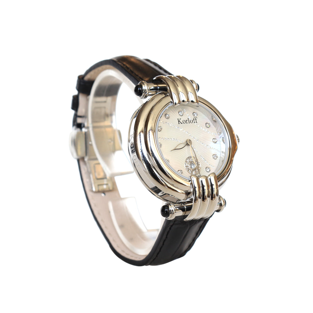 ساعة ماركة كورلوف نسائية من الستيل ميناء لون أبيض صدفي مع مؤشر للتاريخ والالماس على سوار من الجلد الاسود كروكو